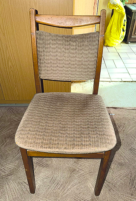 Angeboten wird dieser gut erhaltene Stuhl, eichenbraun, Stoff gut erhalten. Zu verschenken, Tel. (04953-8891).