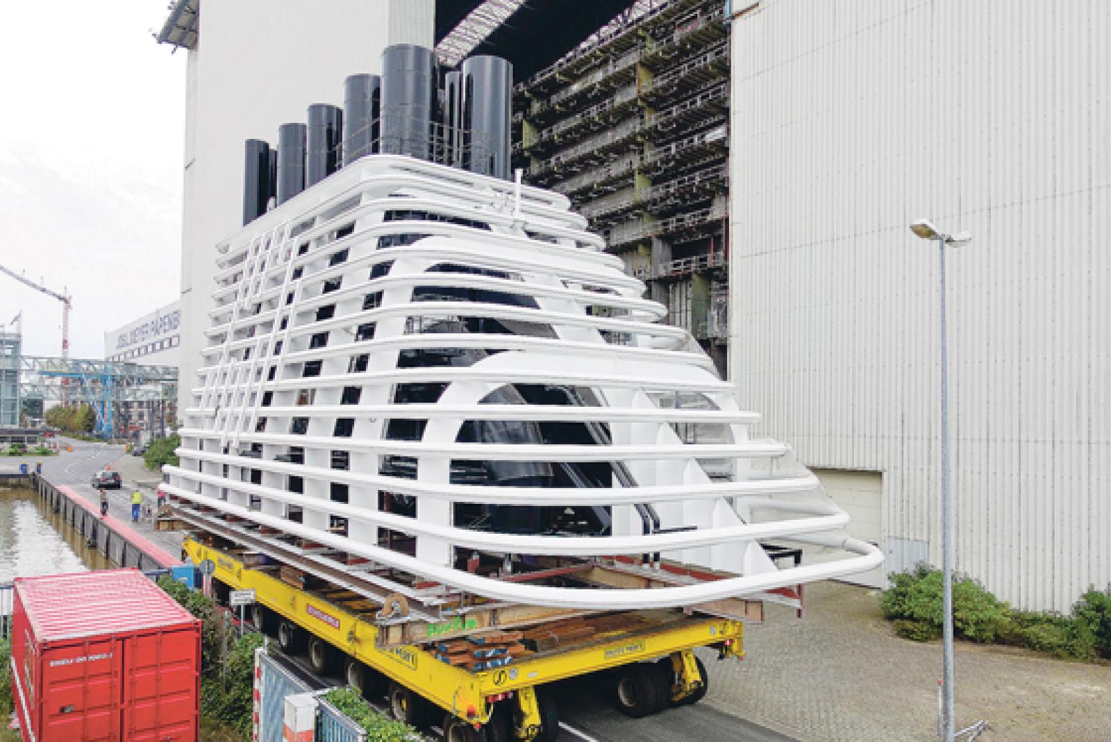 Ein Schwertransport mit dem Schornstein des Kreuzfahrtschiffes »Genting Dream« hat gestern Abend das Gelände der Meyer Werft in Papenburg erreicht.