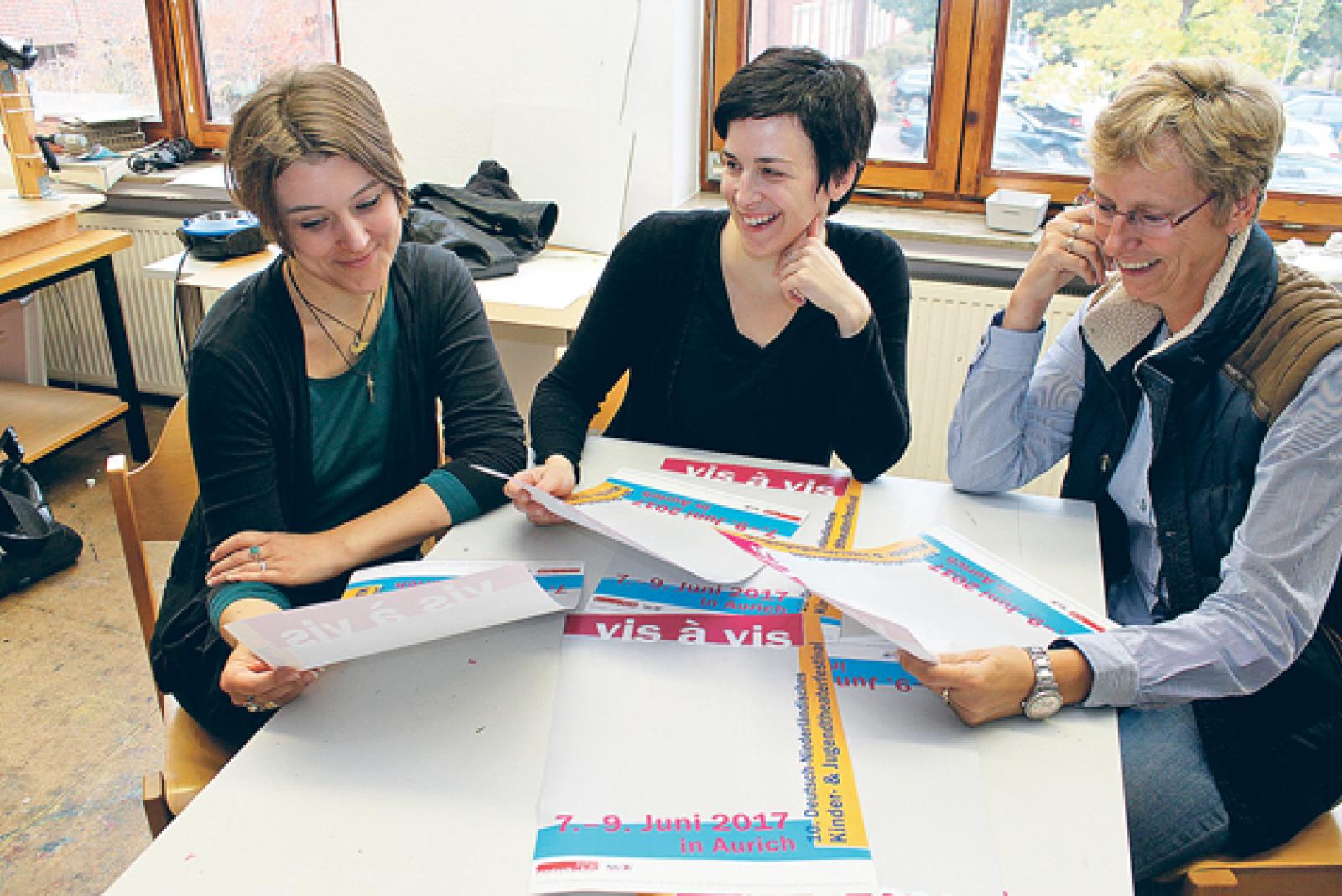 Warten gespannt auf die Plakat-Vorschläge (von links): Britta Hollmann (Landsbühne Nord), Steffi Leferink (Kunstschule »miraculum«) und Brigitte Weber (Kulturamt Aurich). © Foto: Jürgens