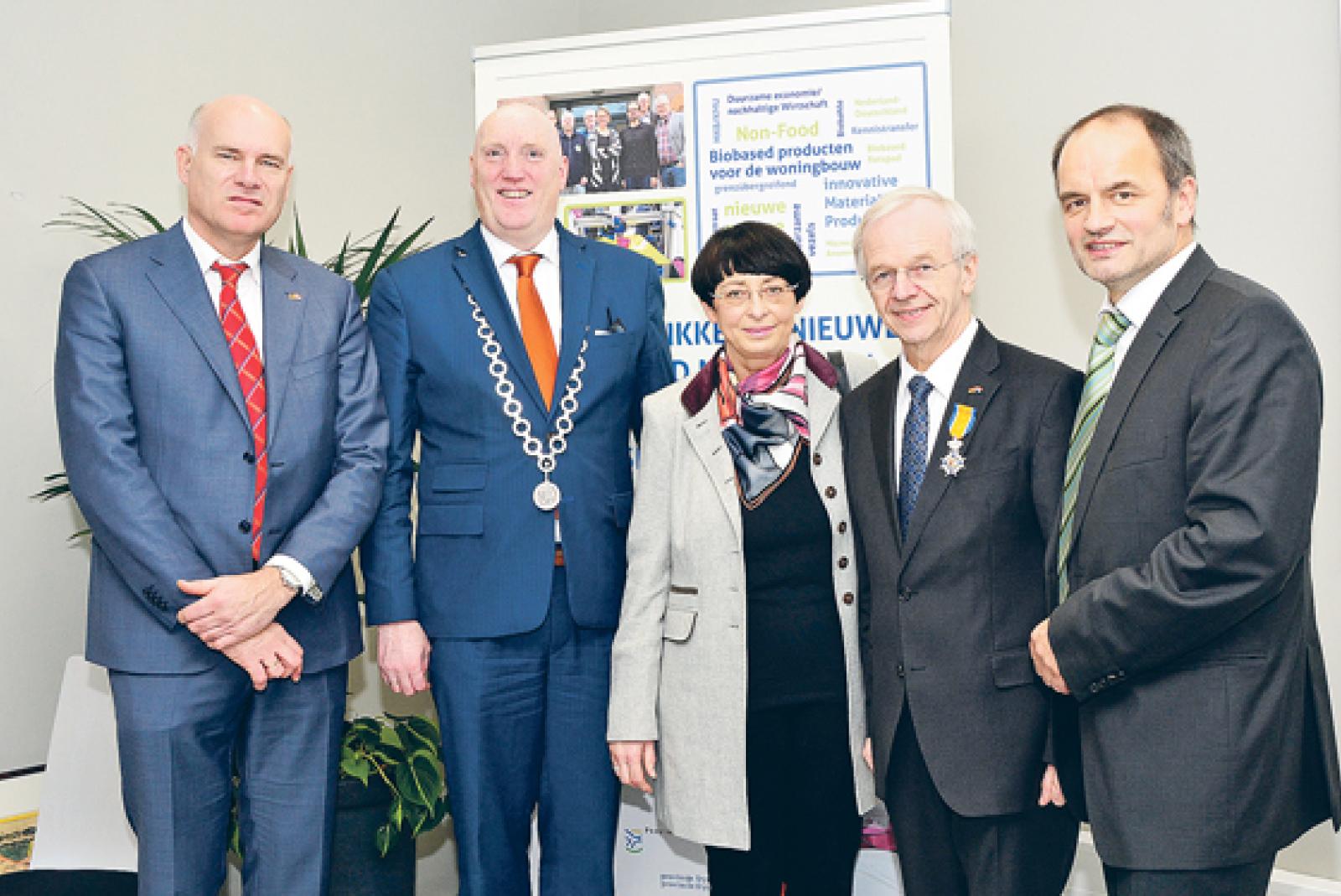 Königlicher Orden für sein langjähriges grenzübergreifendes Engagement: In der Sitzung des Rates der Ems Dollart Region (EDR) gratulierten dem ehemaligen Leeraner Landrat und Vorsitzenden der EDR Bernhard Bramlage (Zweiter von rechts) EDR-Geschäftsführer Karel Groen, Pieter Smit (Bürgermeister der Gemeinde Oldambt), Bramlages Ehefrau Edith Bramlage und EDR-Interreg-Geschäftsführer Hermann Wessels (von links). © Foto: Eden (EDR)