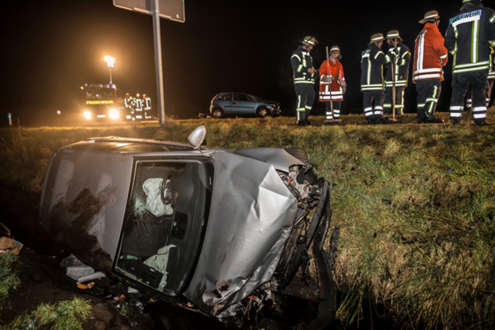 Auf der Uthuser Straße (Bundesstraße 70) in Veenhusen hat sich in der Nacht zu Sonntag ein schwerer Verkehrsunfall ereignet, bei dem auch ein 20-Jähriger aus Bunde schwer verletzt wurde. Auf der Kreuzung war der Rheiderländer mit seinem Opel Corsa mit VW Golf eines 20-jähirgen Moormerländer nach einer Vorfahrtsmissachtung zusammengestoßen. Durch die Wucht des Aufpralls wurde der Golf in den Straßengraben geschleudert, heißt es in einer Mitteilung der Kreisfeuerwehr.