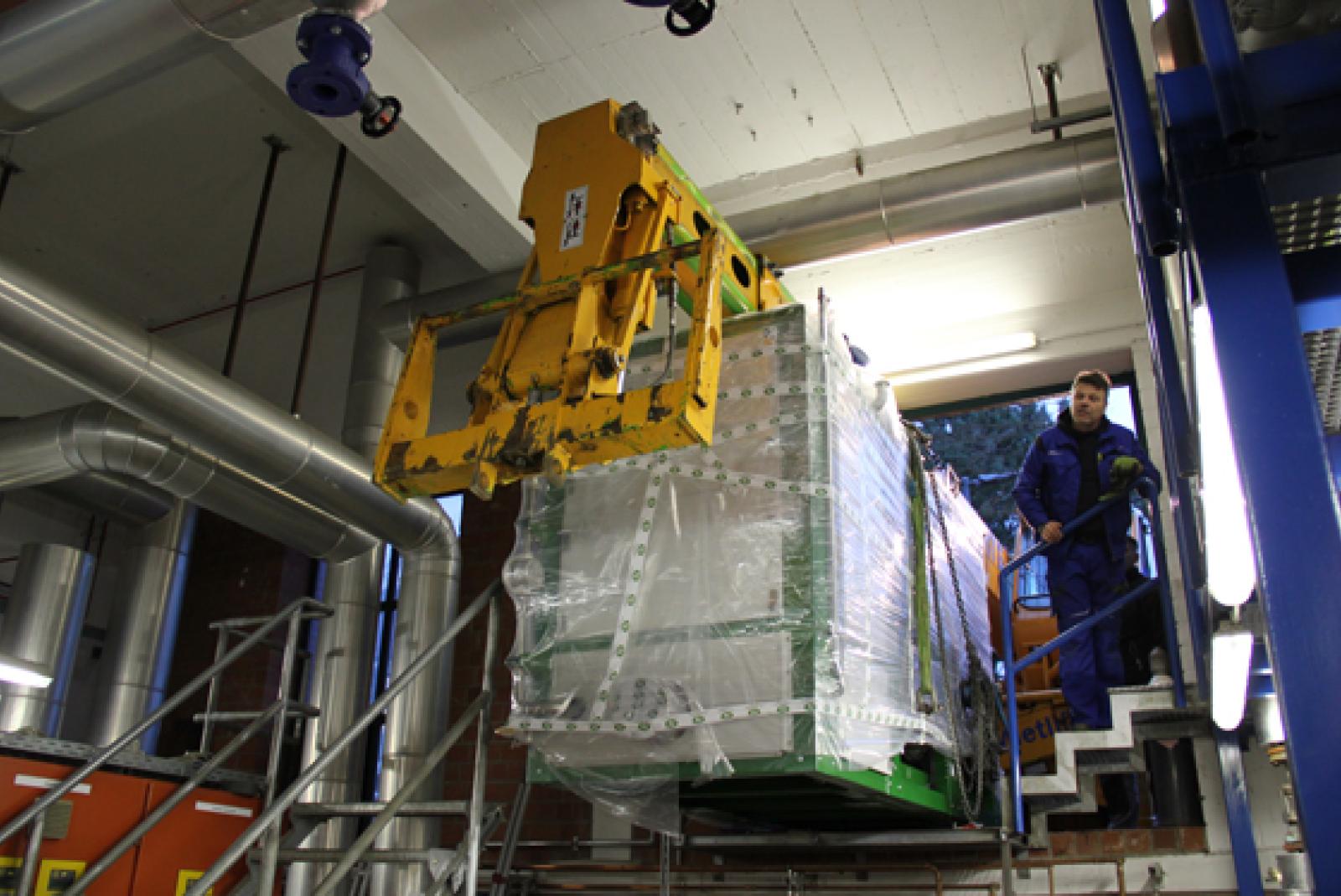 Das gut vier Tonnen schwere Kraftwerk wurde mit einem Kran an seine Position in die Heizungszentrale gebracht. Dabei war Millimeterarbeit gefragt. © Foto: privat