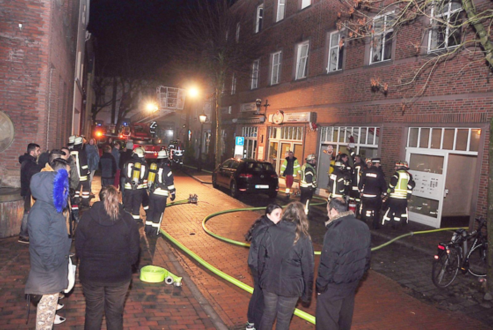 Das Feuer, das im zweiten Obergeschoss ausgebrochen war, hatte sich auch auf eine Zwischendecke ausgedehnt. Um 21.49 Uhr wurde die Feuerwehr alarmiert. Mehr als 50 Einsatzkräfte, vor Ort waren Wehren aus Leer und Bingum, konnten aber eine weitere Ausbreitung der Flammen auf das Dachgeschoss verhindern.
