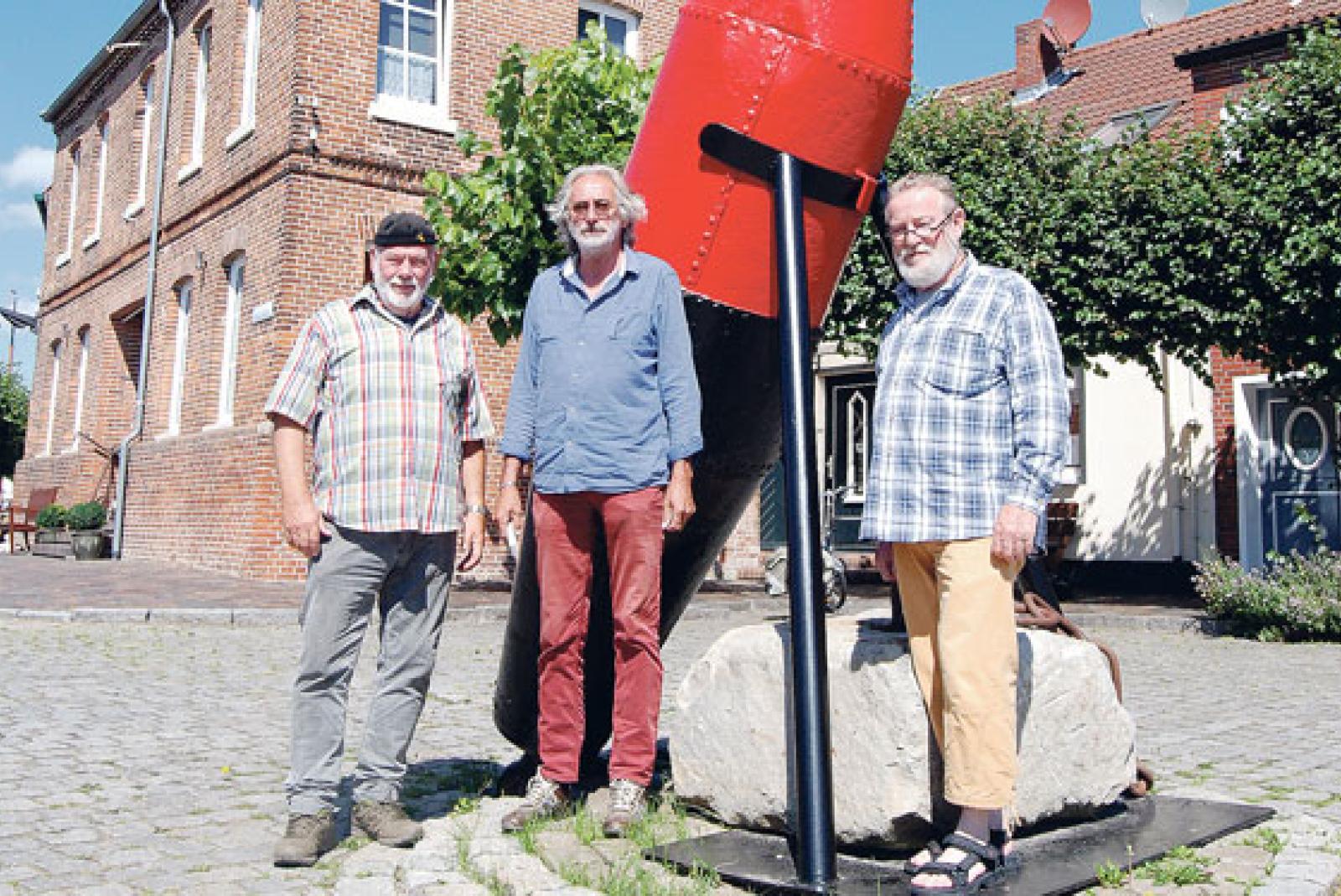 Nicht reden, sondern machen: Franz Schmidt, Bernhard Kissetz und Hartwig Stichternoth (von links) haben jetzt mit Pinsel und viel Farbe dafür gesorgt, dass die große Fahrwassertonne auf dem Wendeplatz der Straße »Am Hafen links« in Weener einen ...