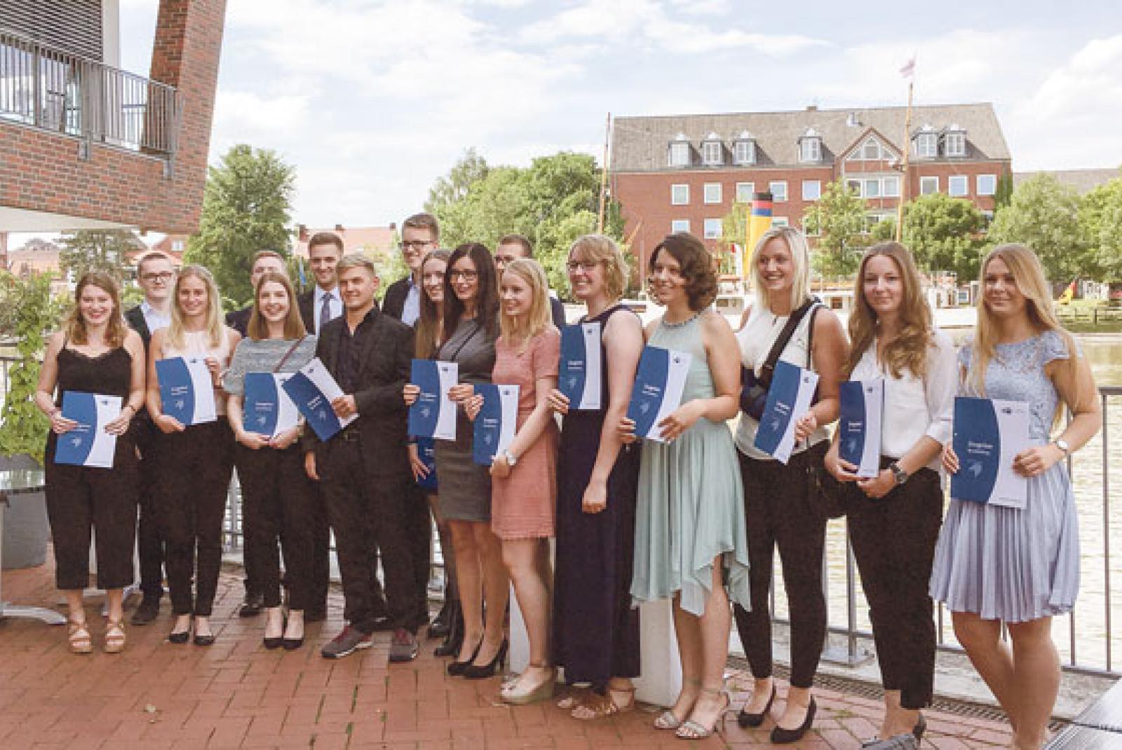 19 Auszubildende zum Schifffahrtskaufmann haben ihre Prüfung jetzt erfolgreich bestanden. Unter ihnen ist mit Sophie Buschkühle aus Bunde auch eine Rheiderländerin. Sie absolvierte ihre Ausbildung bei der Hartmann Shipping Services Germany GmbH. Das Foto entstand bei der Zeugnisübergabe.