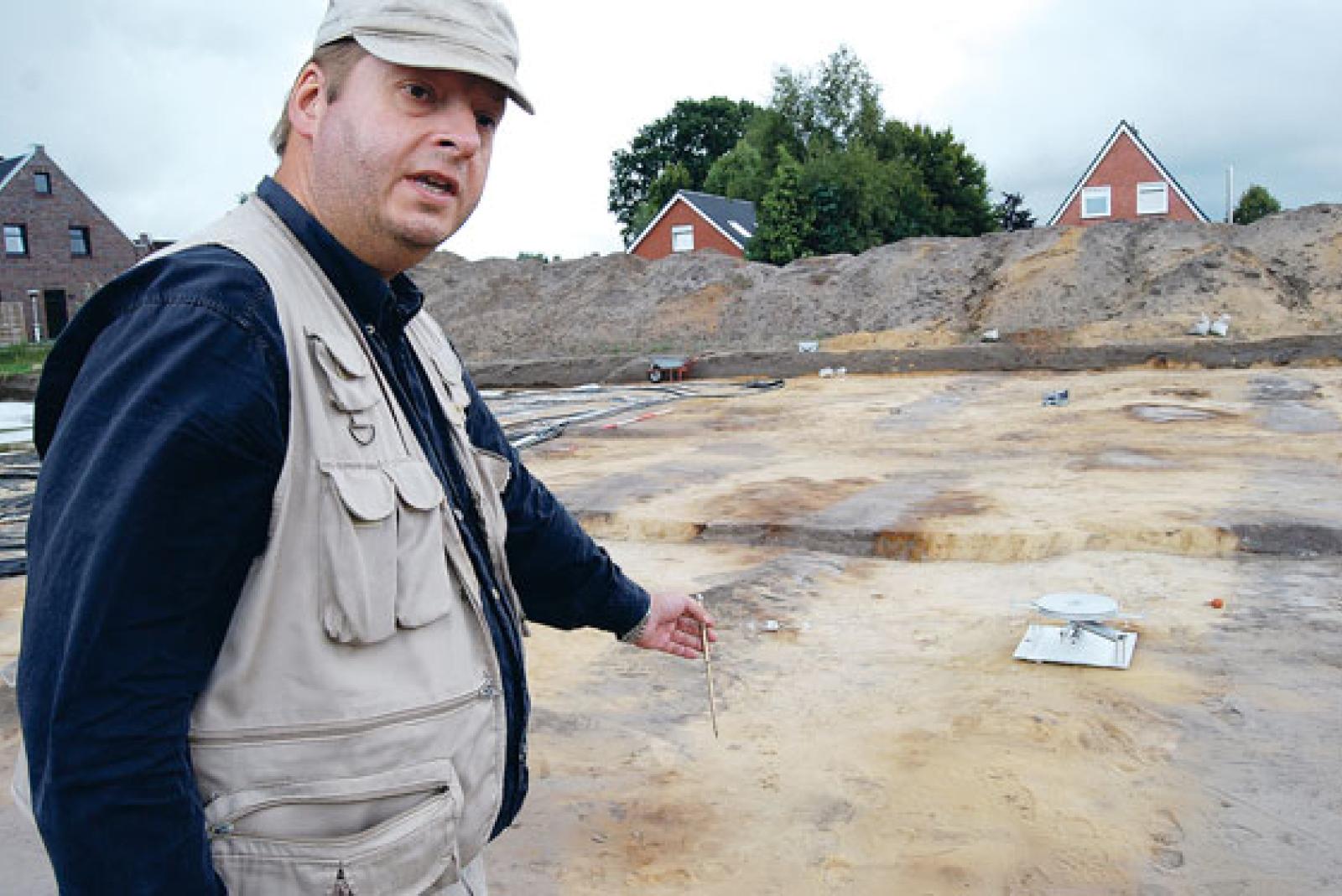 Der Archäologe Cristof Hilgers dokumentiert mit einem Pantographen, einem sogenannten Alleszeichner, die Bodenschnitte im Neubaugebiet »Nördlich Gastuslohne« in Stapelmoor. Voraussichtlich noch bis Mitte September ist hier ein Grabungsteam der Ostfriesischen Landschaft vor Ort. Die Archäologen sind auf ...