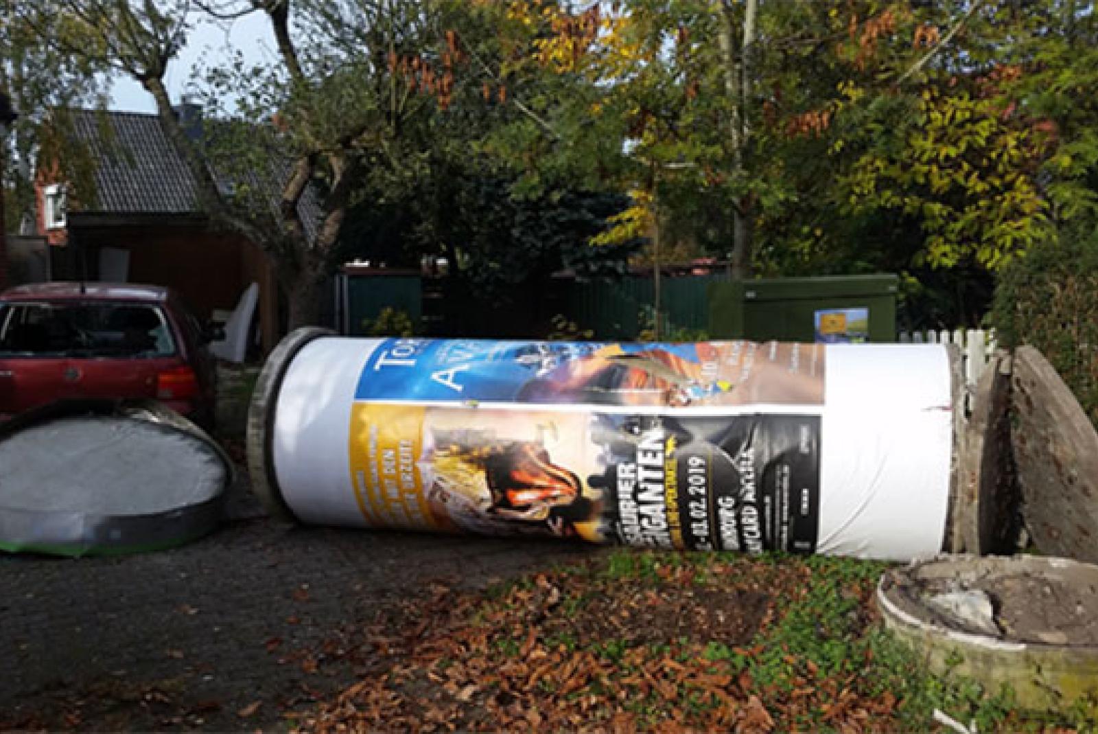 Eine der letzten Litfasssäulen im Leeraner Stadtgebiet ist gestern Morgen von einem Radlader angefahren worden und umgekippt. Die umgestürzte Werbesäule beschädigte dabei einen daneben abgestellten VW Golf.