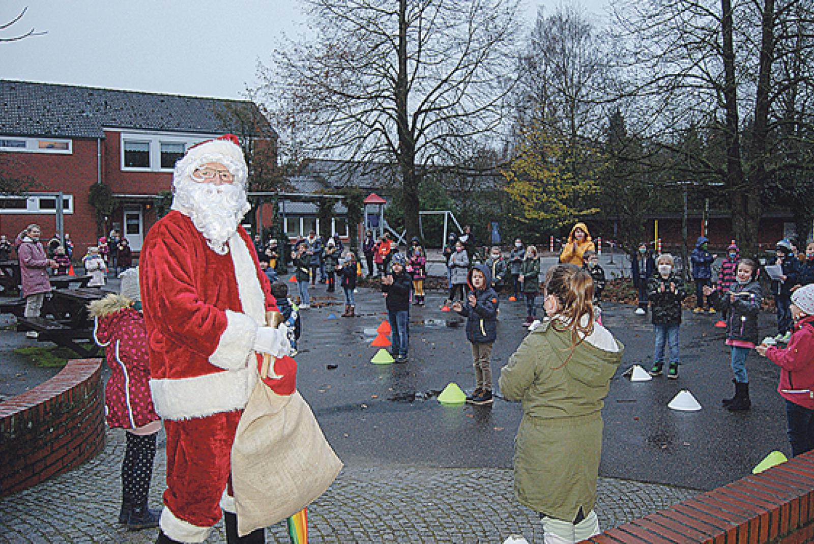 Besuch vom Nikolaus bekamen heute die Schulkinder in Stapelmoor und die Kinder des benachbarten Kindergartens. Dabei begrüßten die 92 Grundschulkinder den Hohen Herrn draußen auf dem Schulhof, und auch die 68 Kindergartenkinder hielten in Zeiten der Corona-Pandemie sicheren Abstand.
