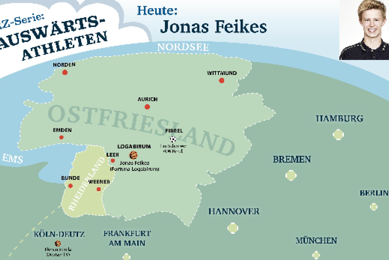 In der Serie »Auswärtsathleten« stellt die RZ wöchentlich einen Sportler aus dem Rheiderland vor, der außerhalb des Rheiderlands aktiv sind. In Teil 3 geht es um Jonas Feikes von Basketball-Regionalligist Hafenbude Baskets Fortuna Logabirum.