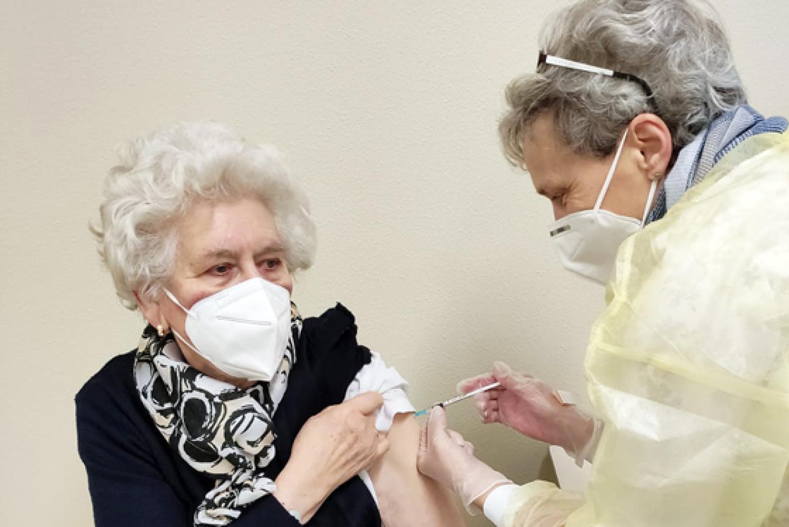 Lena Bohlen (links) gehörte heute Morgen zu den ersten Bürgerinnen, die im Impfzentrum in Hesel ihre Corona-Schutzimpfung erhielten. Geimpft wurde sie von Marion Büttner (rechts).