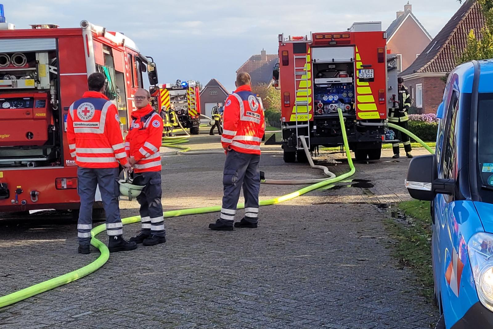 An der Ringstraße in Midlum haben heute ein Carport und ein Schuppen gebrannt, alle vier Feuerwehren aus der Gemeinde Jemgum, also die Wehren Jemgum, Critzum, Ditzum und Holtgaste, waren mit 35 Feuerwehrleuten vor Ort. Alarmiert wurden die Einsatzkräfte um 15.50 Uhr. Laut einer Polizeisprecherin gab es keine Verletzten. Nach ihren Worten fing ein Carport an zu brennen, die Brandursache ist noch ungeklärt. Die Flammen griffen dann auf einen Schuppen über. Mehrere Hühner, die in dem Schuppen gehalten wurden, konnten von der Feuerwehr lebend gerettet werden. Laut Gemeindebrandmeister Jan Remmers waren ein Carport mit benachbartem Geräteschuppen von dem Feuer betroffen, beide zusammen haben eine Fläche von 70 Quadratmetern. Ein Übergreifen der Flammen auf das benachbarte Wohnhaus konnte die Feuerwehr verhindern. Vor Ort kam auch ein Bagger zum Einsatz, um an die Brandherde im Schuppen heranzukommen. Polizei und Feuerwehr waren ebenso wie Rettungssanitäter vor Ort im Einsatz. Um 17.23 Uhr war das Feuer gelöscht. Die Schadenshöhe durch das Feuer beziffert die Polizei auf etwa 20.000 Euro.