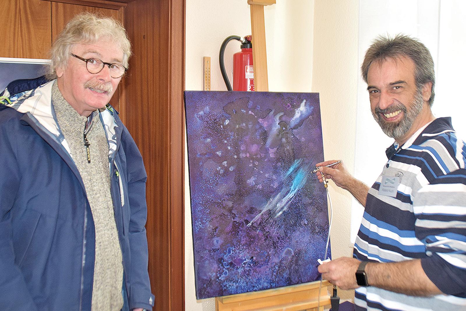 Johannes Kimmel-Groß, links im Bild neben Airbrush-Künstler Roland Kuck, kommt aus dem Ruhrgebiet, aber hat in Ditzum seine zweite Heimat gefunden. Dieses Mal stellte der Künstler und Galerist während der 28. Ditzumer Kunsttage allerdings nicht selbst aus, sondern ...