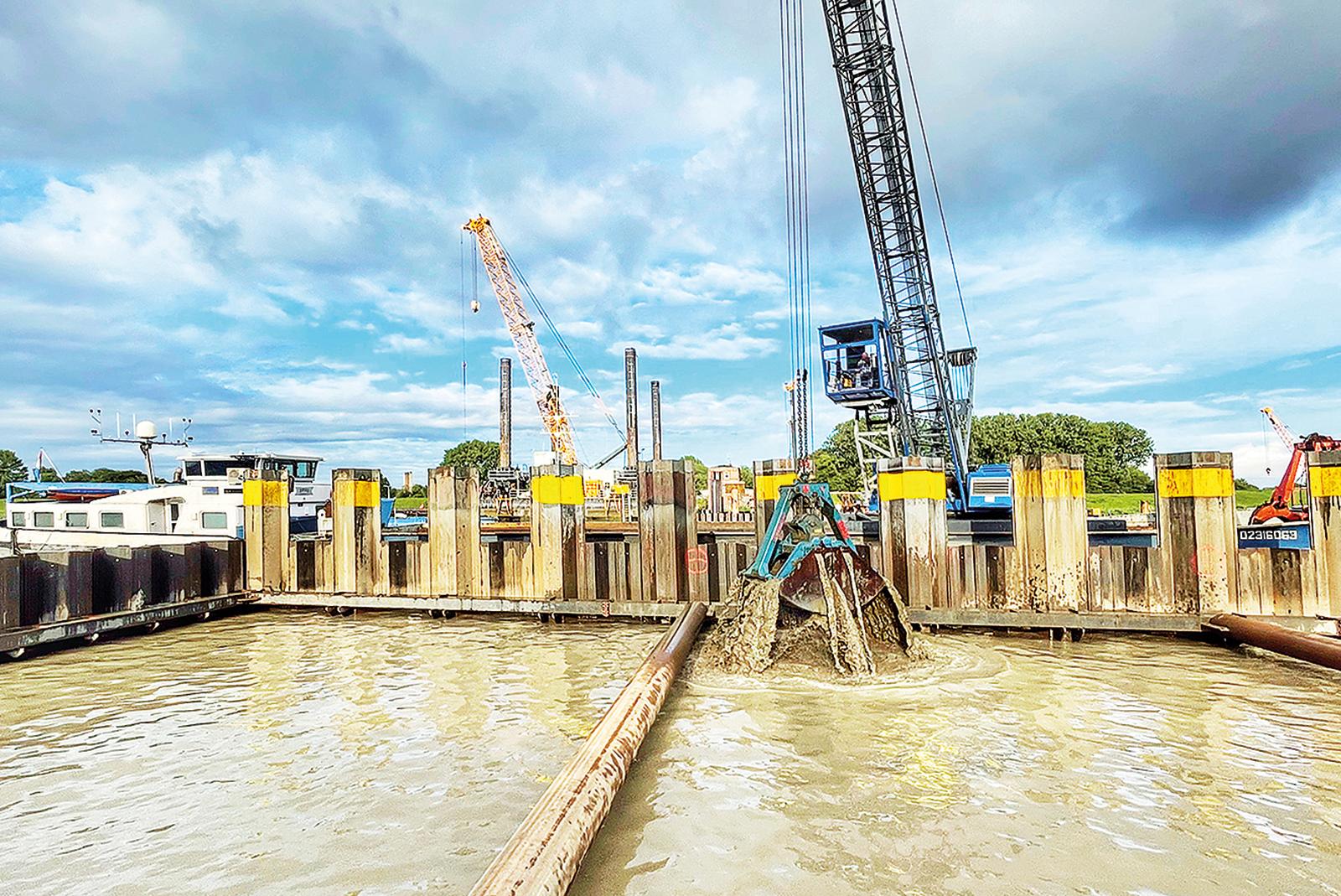 Arbeiten am zukünftigen Drehpfeiler der Friesenbrücke: Die Baugruben wurden mit Gurten stabilisiert. Der Aushub des Spundwandkastens erfolgt. Der Abtransport des Baggergutes wird über den Seeweg mit drei Schiffen durchgeführt. © Foto: DB Netz AG