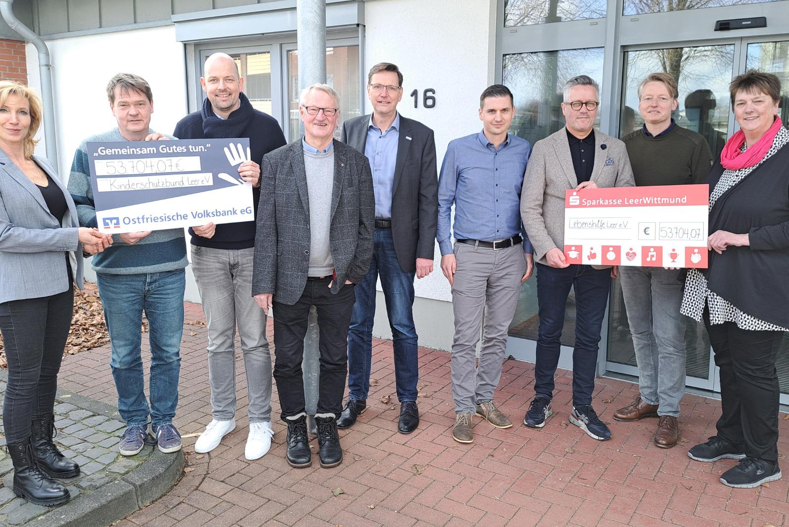 Aus dem Reinerlös der 31. Leeraner Weihnachtverlosung wurden jetzt zwei Schecks über je rund 53.700 Euro von der Werbegemeinschaft an den Kinderschutzbund Leer und die Lebenshilfe Leer überreicht.