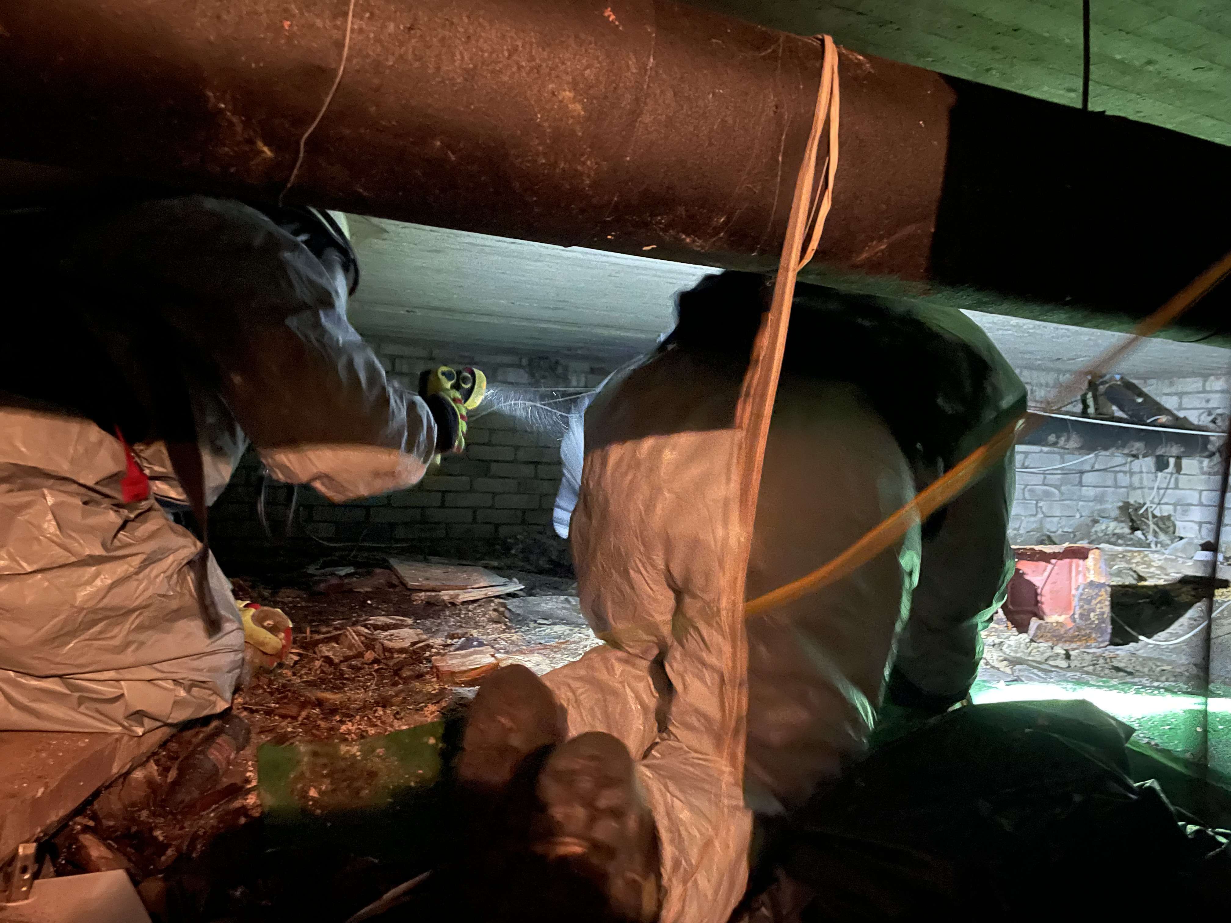 Ein Trupp der Feuerwehr Loga in speziellen Schutzanzügen und unter Atemschutz durchsuchte daraufhin den sehr engen Kriechkeller, in dem in den letzten Jahrzehnten augenscheinlich schon so einiges an Unrat und alten Gegenstände gelagert wurden.