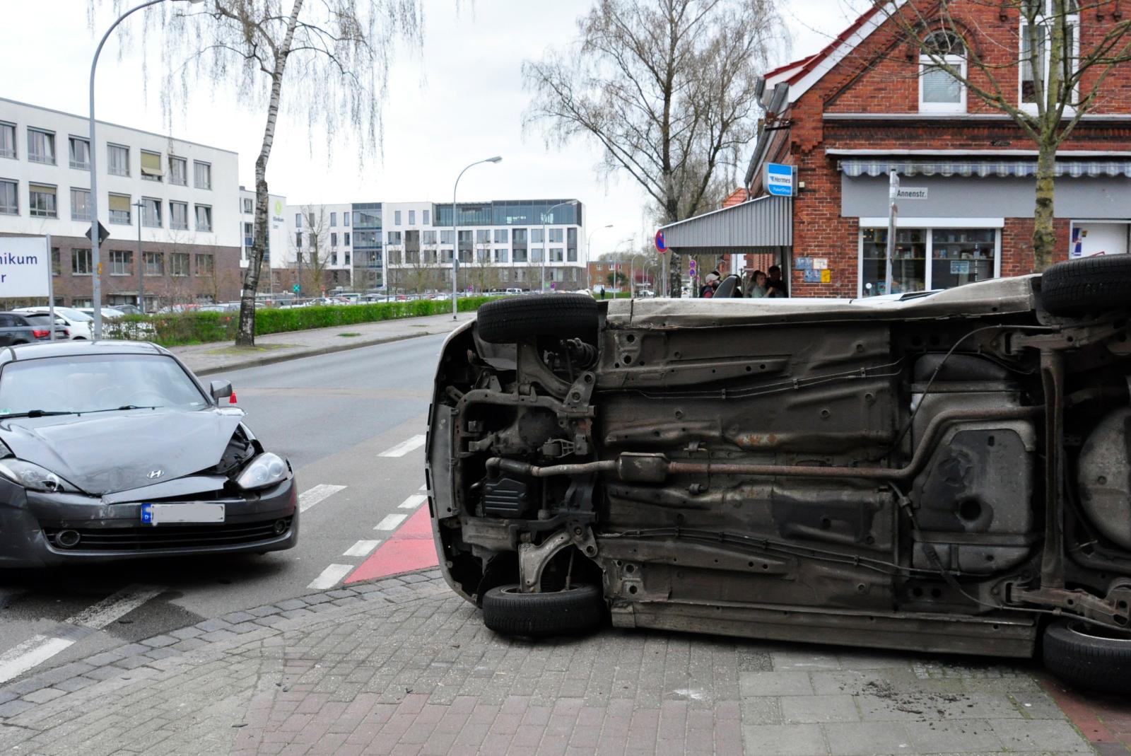 Ein 36-jähriger Autofahrer aus Hannover wollte aus der Annenstraße auf die Augustenstraße auffahren und nahm dabei dem Auto einer 52-jährigen Frau aus Weener die Vorfahrt, im Kreuzungsbereich stießen beide Fahrzeuge zusammen. Der Aufprall war so heftig, dass der Wagen des Hannoveraners auf der Seite liegen blieb. Der Mann wurde leicht verletzt und ins Krankenhaus gebracht.