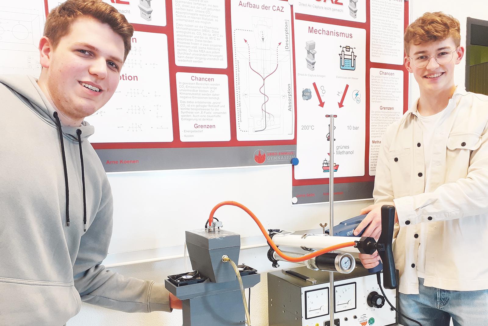 Arne Koenen aus Möhlenwarf und Jarne Seibt beschäftigt angesichts des Klimawandels seit Jahren eine Frage: Wie kann man CO2 aus der Atmosphäre holen? Nun haben die beiden 19-jährigen Schüler des Ubbo-Emmius-Gymnasiums ein Modell entwickelt, bei ...