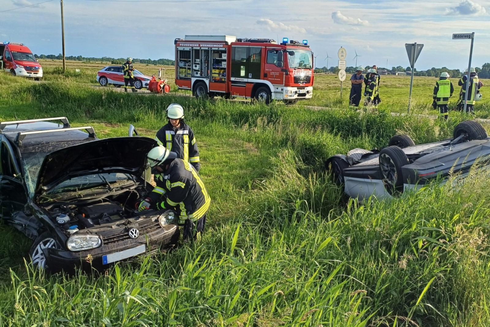 Der Unfall ereignete sich auf der Kreuzung Bovenhusen (K36) und Middelweg. Die Feuerwehren aus Weenermoor und Weener wurden gegen 18.56 Uhr alarmiert. Zunächst hieß es, ein Insasse sei eingeklemmt. Beim Eintreffen der ersten Einsatzkräfte hatten die Unfallbeteiligten die Fahrzeuge bereits aus eigener Kraft verlassen, so die Feuerwehr Weener in einer Mitteilung. Da es sich bei einem Fahrzeug um ein E-Auto handelte, war für die Einsatzkräfte besondere Vorsicht geboten.
