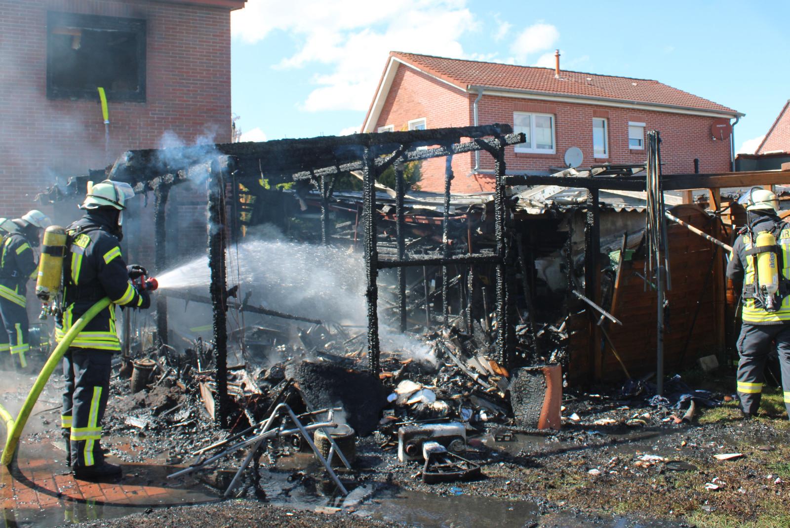 Die Feuerwehr Weener ist heute gegen 16 Uhr zu einem Brandeinsatz in die Breslauer Straße in Weener ausgerückt. Dort war zunächst ein Schuppenbrand gemeldet worden. Ein Holzschuppen war direkt an einem Wohnhaus in Brand geraten. Durch das Feuer waren im Erdgeschoss und im Obergeschoss des Wohnhauses bereits Scheiben geborsten und das Feuer drohte auf das komplette Gebäude überzugreifen.