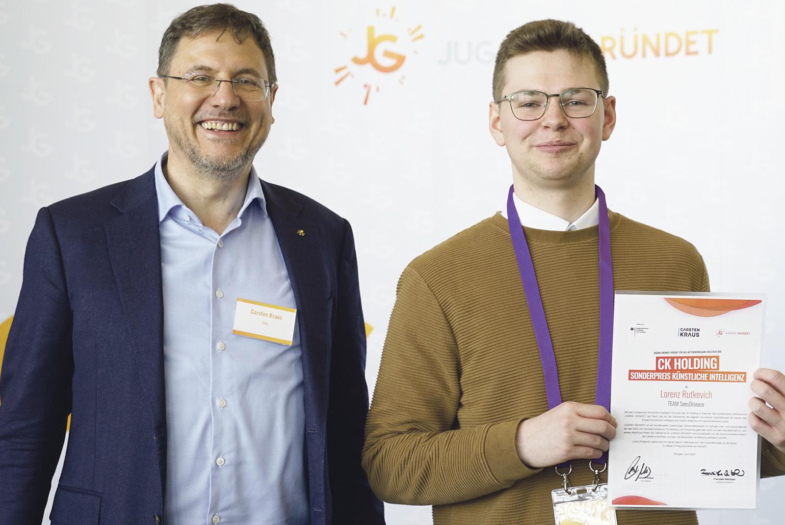 Stolz hält der Leeraner Lorenz Rutkevich die Urkunde des Wettbewerbs »Jugend gründet« in den Händen, die ihm Jury-Mitglied Carsten Kraus (CK Holding GmbH, links) beim Bundesfinale in Stuttgart überreicht hat. Der 17...