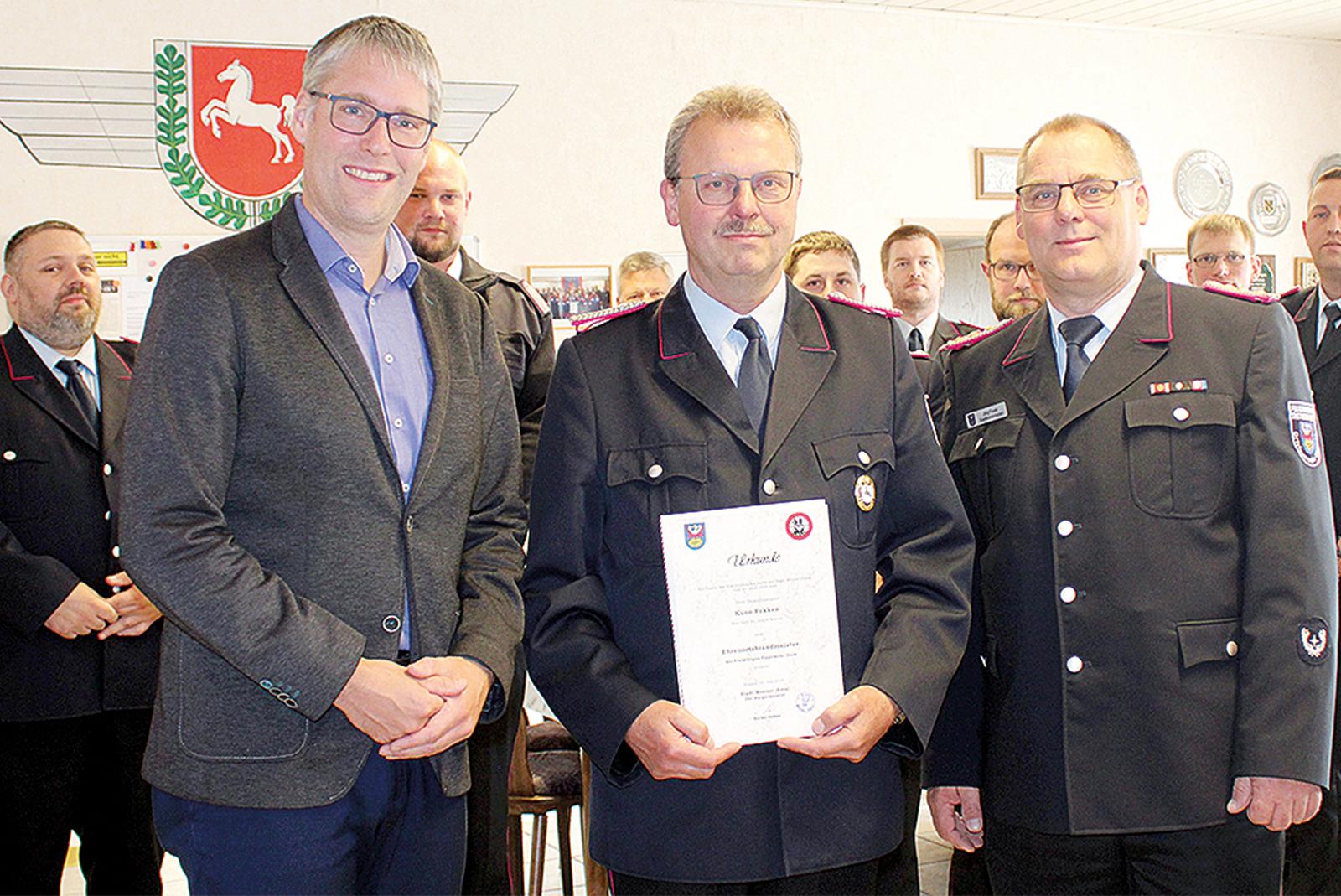 Bürgermeister Heiko Abbas (vorne links) hat jetzt Kuno Fokken seine Ernennungsurkunde als Ehrenortsbrandmeister der Freiwilligen Feuerwehr Diele überreicht. Den passenden Rahmen dazu bildete die Sitzung des Stadtkommandos der Feuerwehren der Stadt Weener, das sich dazu in Diele traf. Bü...