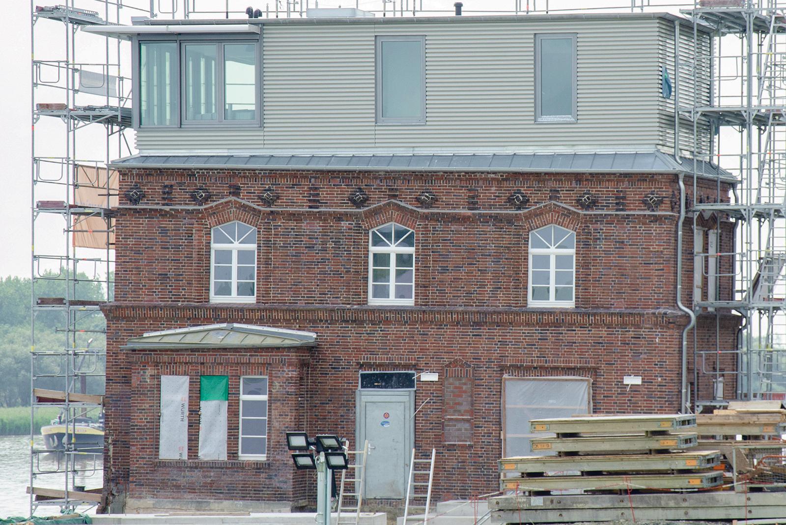 Das sanierte und aufgestockte Brückenwärterhaus für die neue Friesenbrücke zeigt sein neues Antlitz. Die Nordseite der Fassade lässt mit den Sprossenfenstern schon jetzt den »Retro-Charme« des unter Denkmalschutz ...