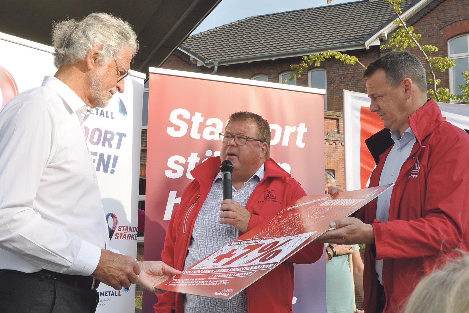 Bei einer Versammlung vor dem Leda- Werk an der Groninger Straße in Leer haben Gewerkschaftsmitglieder ihre Forderungen zum Start der Tarifrunde für die Metall- und Elektroindustrie bekräftigt.