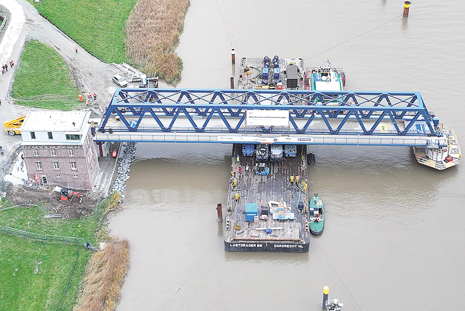Überbau-Element der neuen Friesenbrücke an seinem Platz in Weener