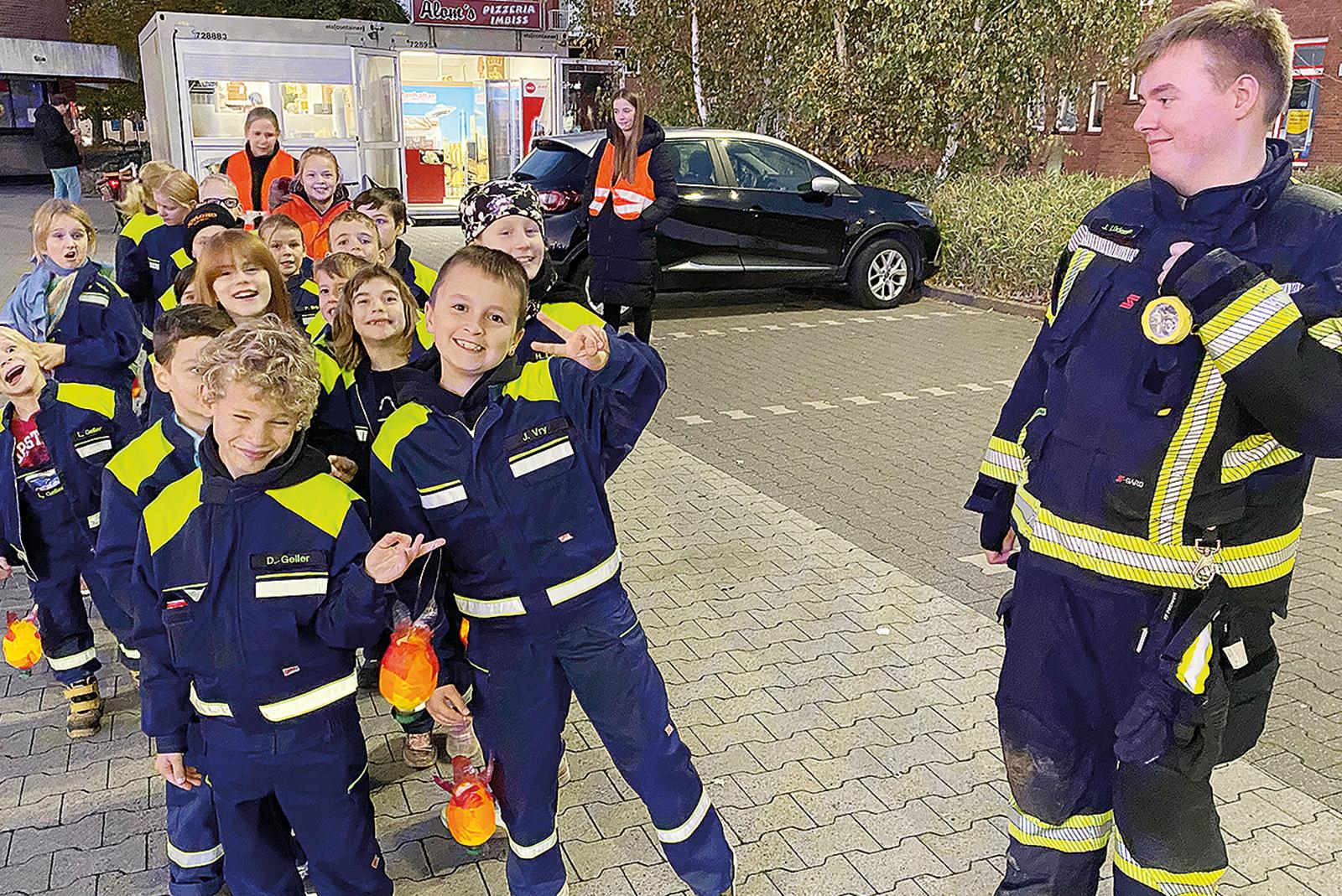 Mit Feuerwehrmann Julian Lüdemann als »Zugführer« (rechts) zog die Kinderfeuerwehr am Sonnabend in Weener »mit selbstgebastelten und angezündeten Lichtlein von Tür zu Tür«. Die Kinder haben dabei sichtlich Spaß. Als »Zugführer« wurde Lüdemann ...