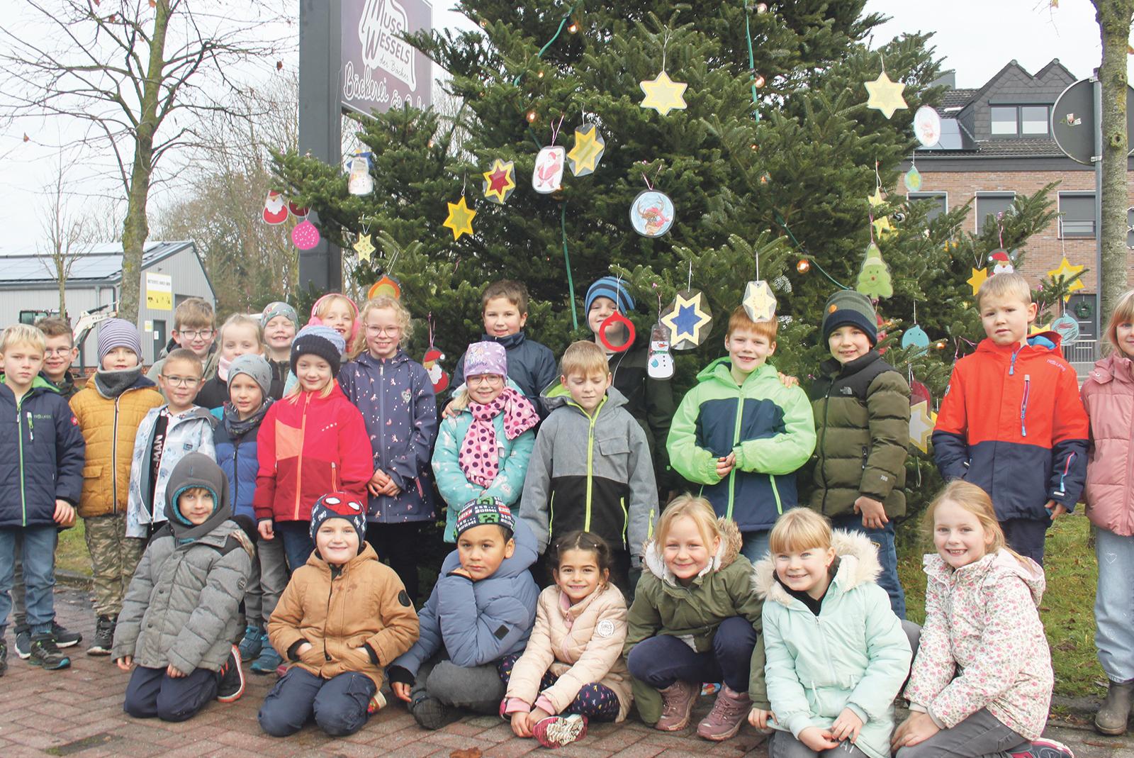 Fleißige Erstklässler schmücken Weihnachtsbaum