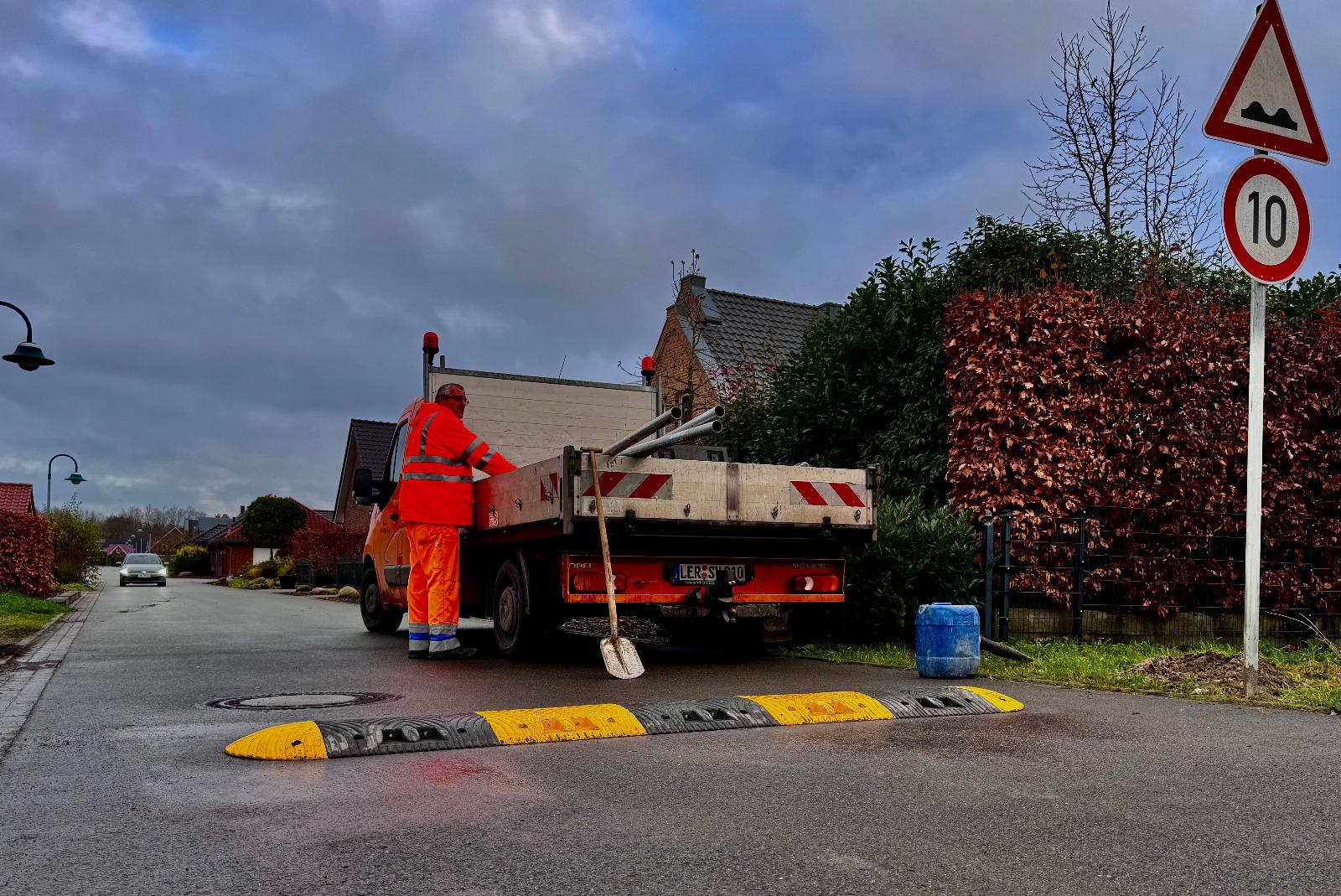 Die Stadt Weener bremst den Meedenweg aus. Am Montag sind dort zwei Fahrbahnschwellen aufgebracht worden. Damit reagiert die Verwaltung auf die Forderung von Anwohnern aus dem aus dem Meedenweg und dem Hirtenweg.