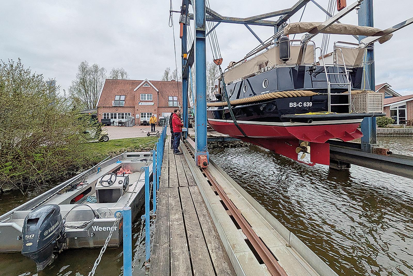 Mit dem Ende der Winterpause herrscht zurzeit wieder reges Treiben am Sportboothafen in Weener. Mit Hilfe der Hublift-Anlage beim Restaurant »Hafenblick« lassen Frank Klaassen und Jan-Dirk Holtkamp von der Hafen Weener GmbH aktuell ein Boot nach dem anderen ...