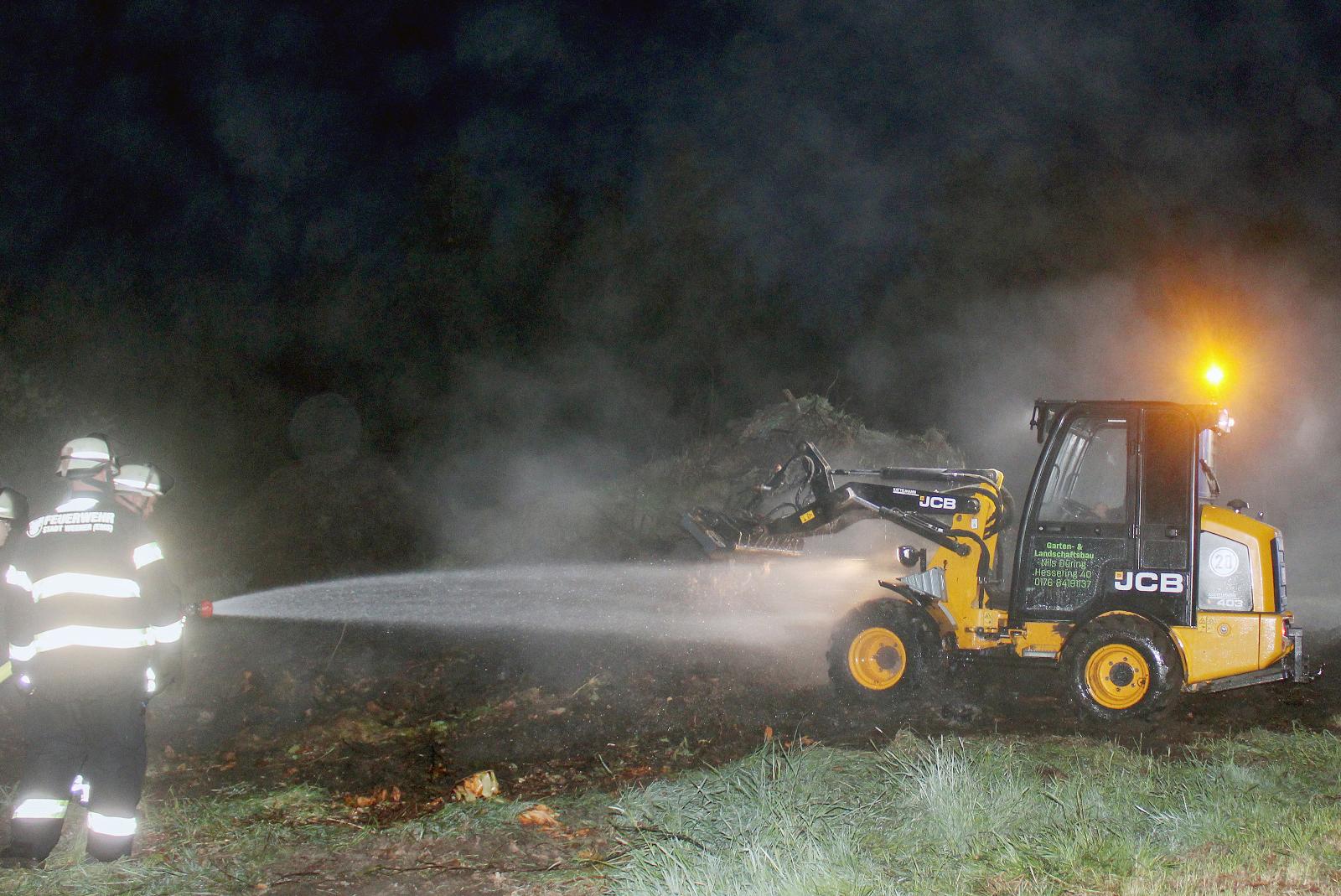 Um auch tieferliegende Glutnester effektiv ablöschen zu können und eine erneute Entzündung zu verhindern, wurde der brennende Haufen mit einem Radlader auseinandergezogen und anschließend abgelöscht.