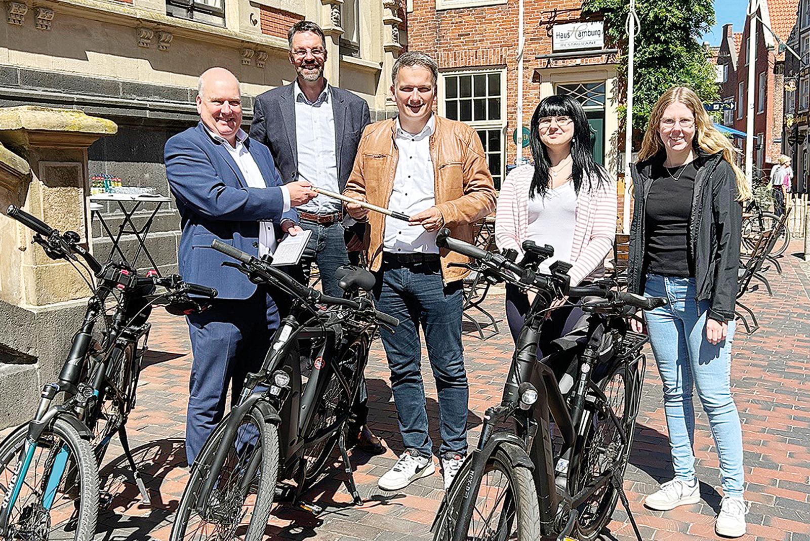 Staffelstab-Übergabe bei der diesjährigen Stadtradeln-Staffel: Am Montagmittag übergab die Gemeinde Bunde, vertreten durch Bürgermeister Uwe Sap und Stadtradeln-Koordinatorin Wiebke Tülp, den Stab an die Stadt Leer.