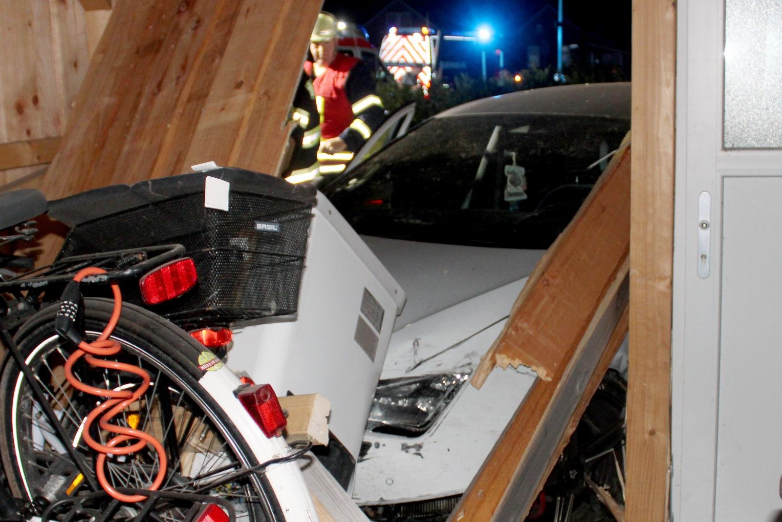 Das Fahrzeug durchfuhr zunächst eine Hecke, beschädigte anschließend ein Wohnhaus, da es gegen die Hauswand fuhr, und kam schließlich in einem Schuppen zum Stehen. Beim Eintreffen der Einsatzkräfte waren alle drei Insassen bereits aus dem Fahrzeug befreit. Eine Personenrettung durch die Feuerwehr war somit nicht erforderlich.