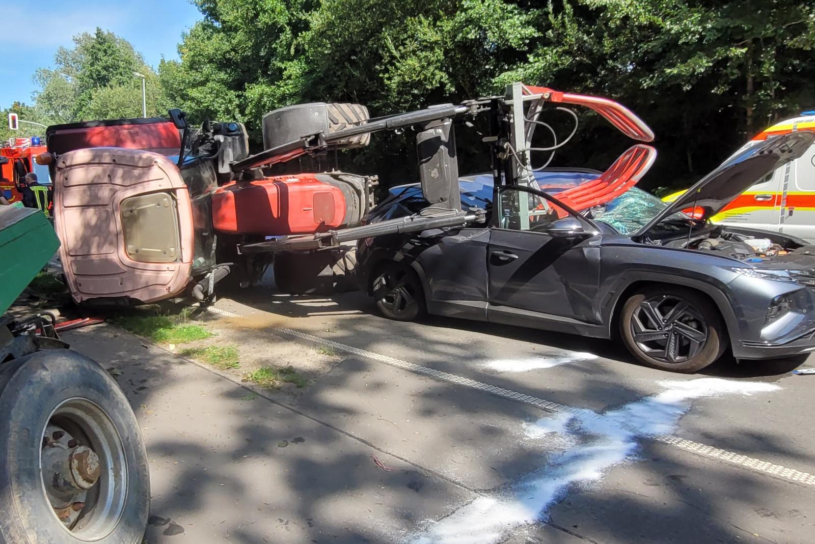 Fahrer bemerkt Verkehrsstau zu spät - Traktor mitsamt Anhänger kippt um