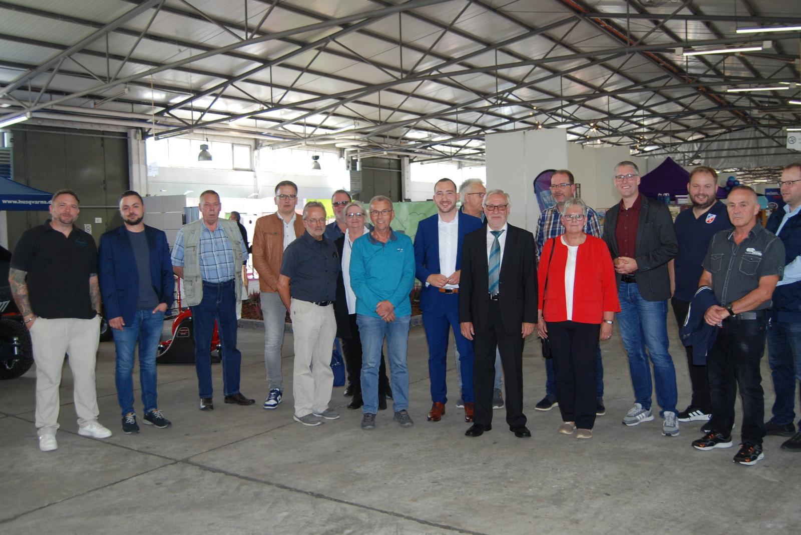 Gastgeber und Gäste vor dem Rundgang durch die Halle der Gewerbeschau nach der offiziellen Eröffnung. Dritter von links Helmut Plöger, stellvertretender Bürgermeister von Jemgum, neben ihm Uwe Sap, Bürgermeister von Bunde. Vierter von rechts Weeners Bürgermeister Heiko Abbas, neben ihm Hildegard Hinderks und Evert Pastoor, Vorsitzender der Werbegemeinschaft. © Hoegen