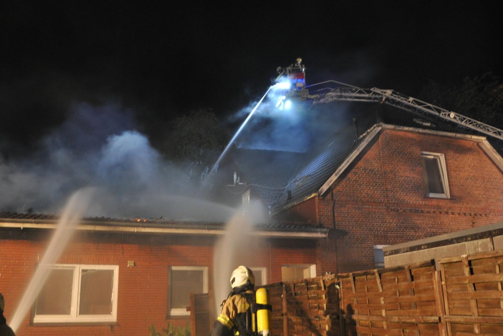 Der Dachstuhl eines Haus-Anbaus in Logabirum stand am späten Sonntagabend in Flammen. Die Feuerwehr wurde um 22.46 Uhr zu dem Einsatz in der Logabirumer Straße gerufen.