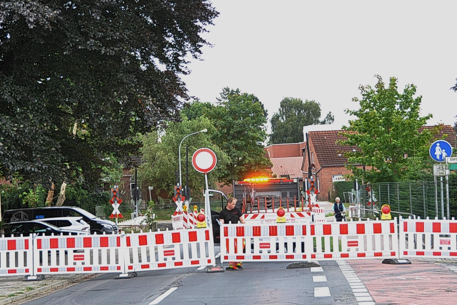 Bahnübergang ist wegen Straßen- und Gleisbauarbeiten unpassierbar