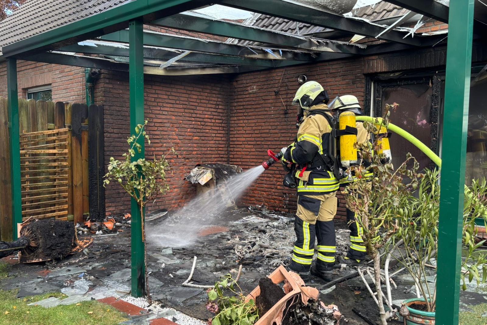 Durch das schnelle und gezielte Eingreifen der Feuerwehr konnte ein Übergreifen der Flammen auf das Wohnhaus verhindert werden. Die dreifach verglaste Terrassentür hielt der starken Hitze so lange stand, bis der Löschangriff wirksam war, heißt es in der Mitteilung. Auf der Terrasse befanden sich unter anderem ein Heizpilz, Gartenmöbel sowie ein Gasgrill. Zwei Gasflaschen mussten aus dem Brandbereich geborgen werden, bevor es zu einer gefährlichen Explosion kommen konnte. Nach rund einer Stunde war der Einsatz beendet. Terrasse und Teile der Fassade wurden erheblich beschädigt, das Innere des Hauses blieb jedoch rauch- und feuerfrei. Menschen kamen nicht zu Schaden. Die Polizei hat die Ermittlungen zur Brandursache aufgenommen.