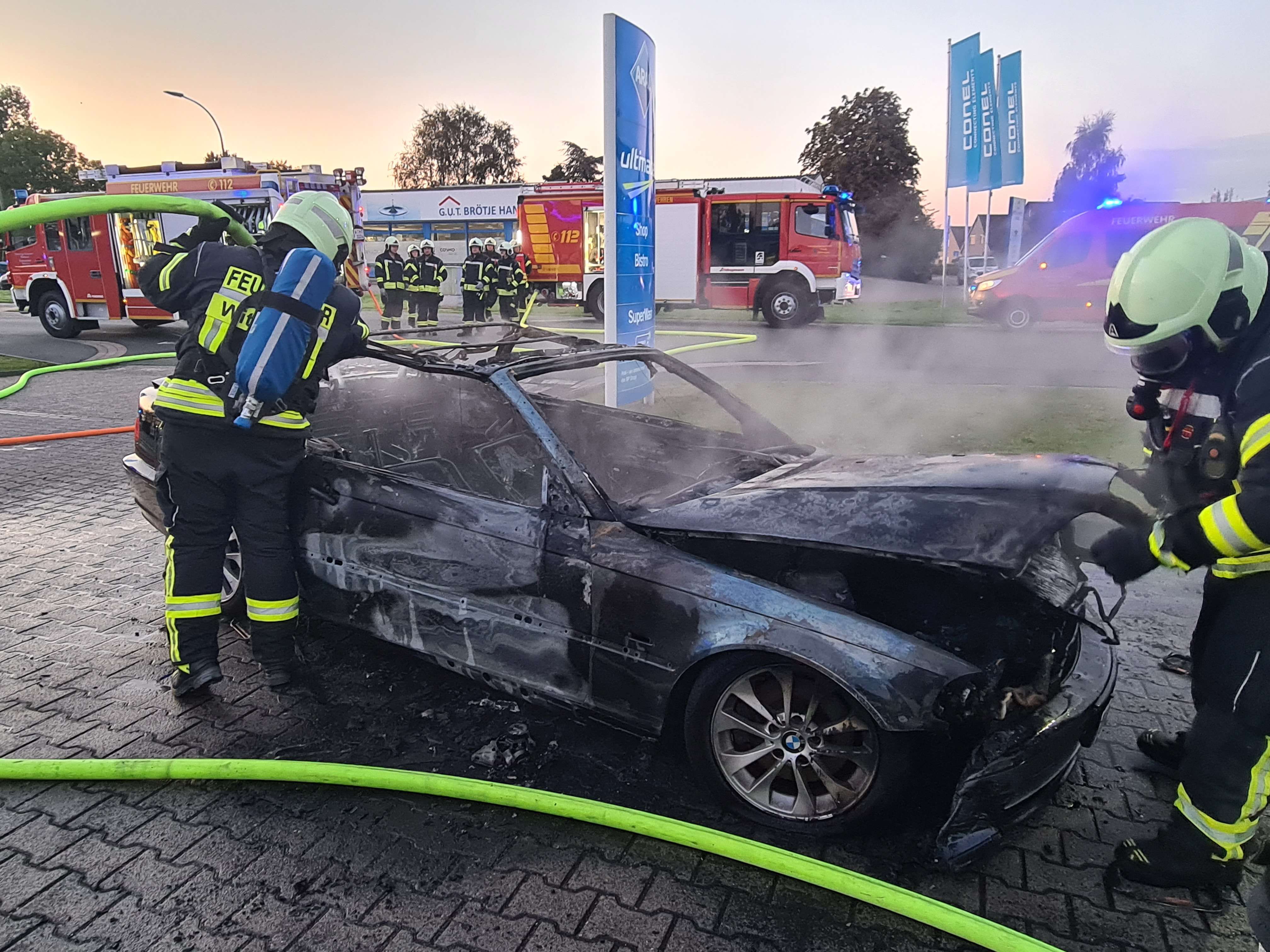 Heute wurde die Ortsfeuerwehr Wittmund um 7.01 Uhr zu einem Autobrand an einer Tankstelle in der Jeverstraße in Wittmund alarmiert. “Auf der Anfahrt konnte man schon eine schwarze Rauchwolke über dem Bereich sehen”, schreibt die Feuerwehr in ihrem Einsatzbericht.