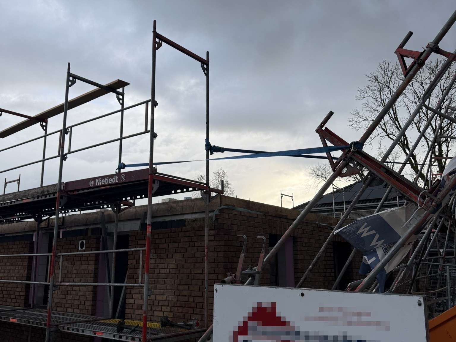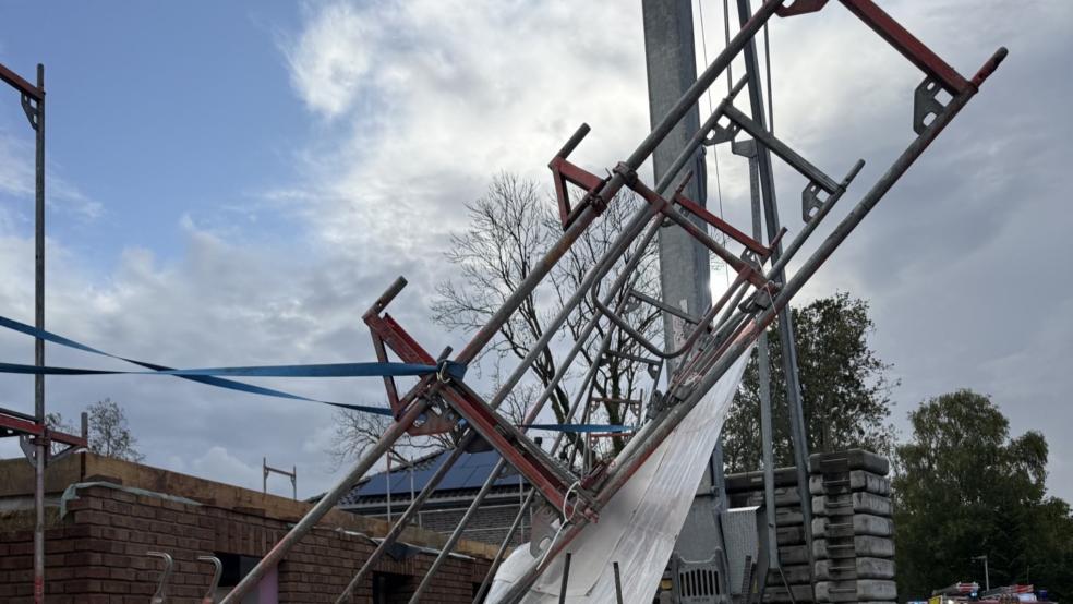 Kräftige Windböen haben am Samstagnachmittag ein Baugerüst in der Wilhelmine-Siefkes-Straße in Haxtum (Aurich) in Schieflage gebracht. Anwohner befürchteten, dass es in Gänze umstürzen könnte, weshalb sie einen Notruf absetzten. Durch die Wittmunder Regionalleitstelle sind daraufhin die Feuerwehr Haxtum und die Drehleiter der Feuerwehr Aurich alarmiert worden. Die Einsatzkräfte setzten laut Mitteilung der Feuerwehr vor Ort kurzerhand einige Spanngurte ein, um das Gerüst zu sichern und ein weiteres Umkippen unterbinden zu können. Zudem wurde die Baustelle weiträumig mit Absperrband gesichert. Nach gut einer halben Stunde war die Gefahrensituation beseitigt, die Drehleiter brauchte nicht mehr eingesetzt werden.