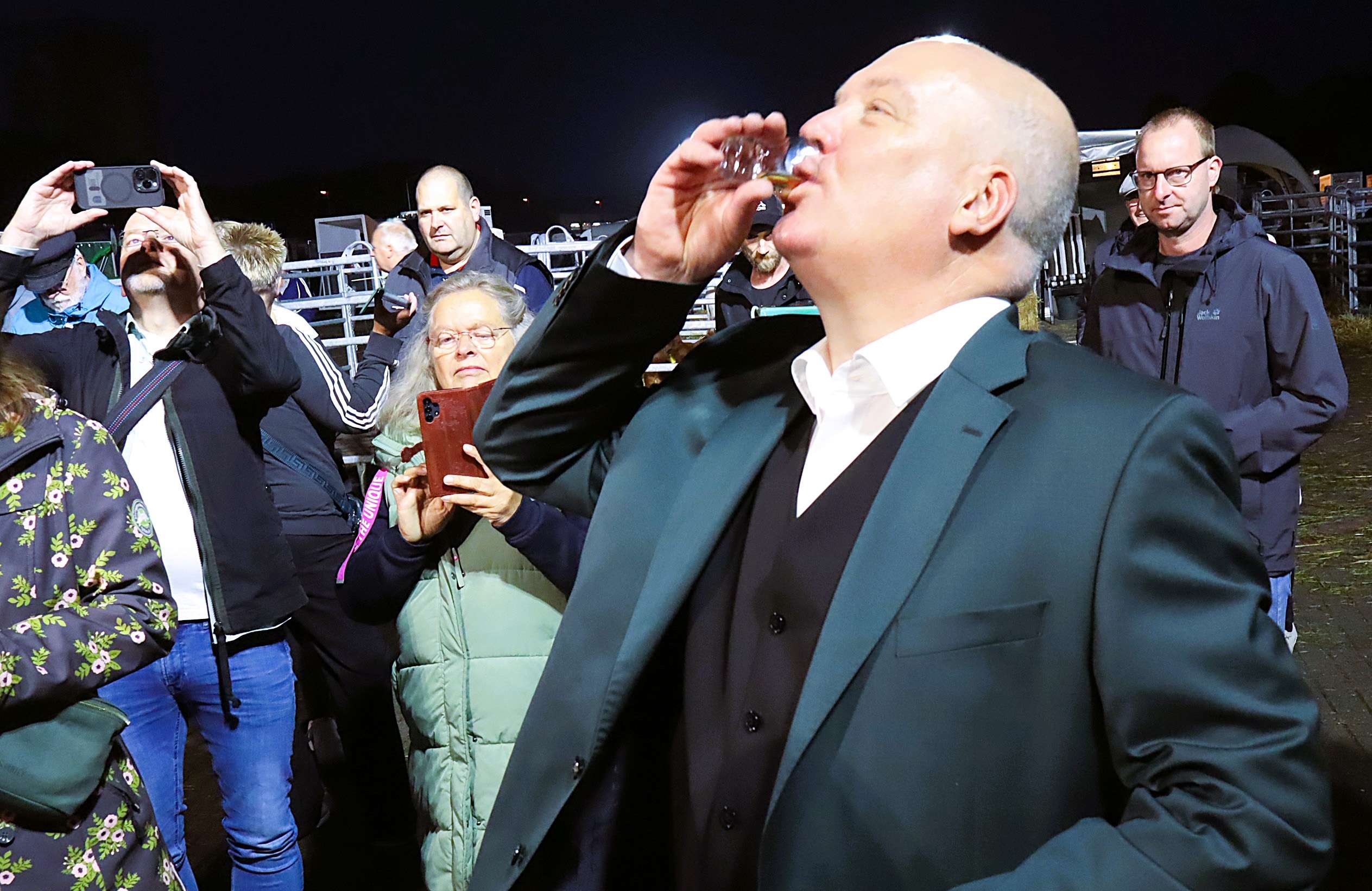 Mit Kleintieren sind laut Viehmarktmeister Thomas Akkermann etwa 1000 Tiere da. „Es sind wieder mehr Großtiere als vergangenes Jahr – dieses Mal um die 750“, so Akkermann. Nur wenige Minuten später verrät der Viehmarktmeister dem Bürgermeister der Stadt Leer eine gute Nachricht: "Alle Tiere sind verkauft". Darauf gibt es erst mal einen kräftigen Schluck. Während hinter der Ostfrieslandhalle die ersten Tiere abtransportiert werden, hat etwas weiter rechts der Clan of Kerry ein kleines Lager aufgeschlagen. Zwischen Fellen und Zeltwänden sitzen eine Magierin, ein Lord, Musiker und auch ein Bogenmacher. Die Herolde sind schon wieder weiter. Um 11.30 Uhr eröffnen sie gemeinsam mit Trevor Heeks den 517. Gallimarkt. Dann hören wir ein letztes Mal: "Hip, Hip, Hooray, ich liebe Gallimarkt".