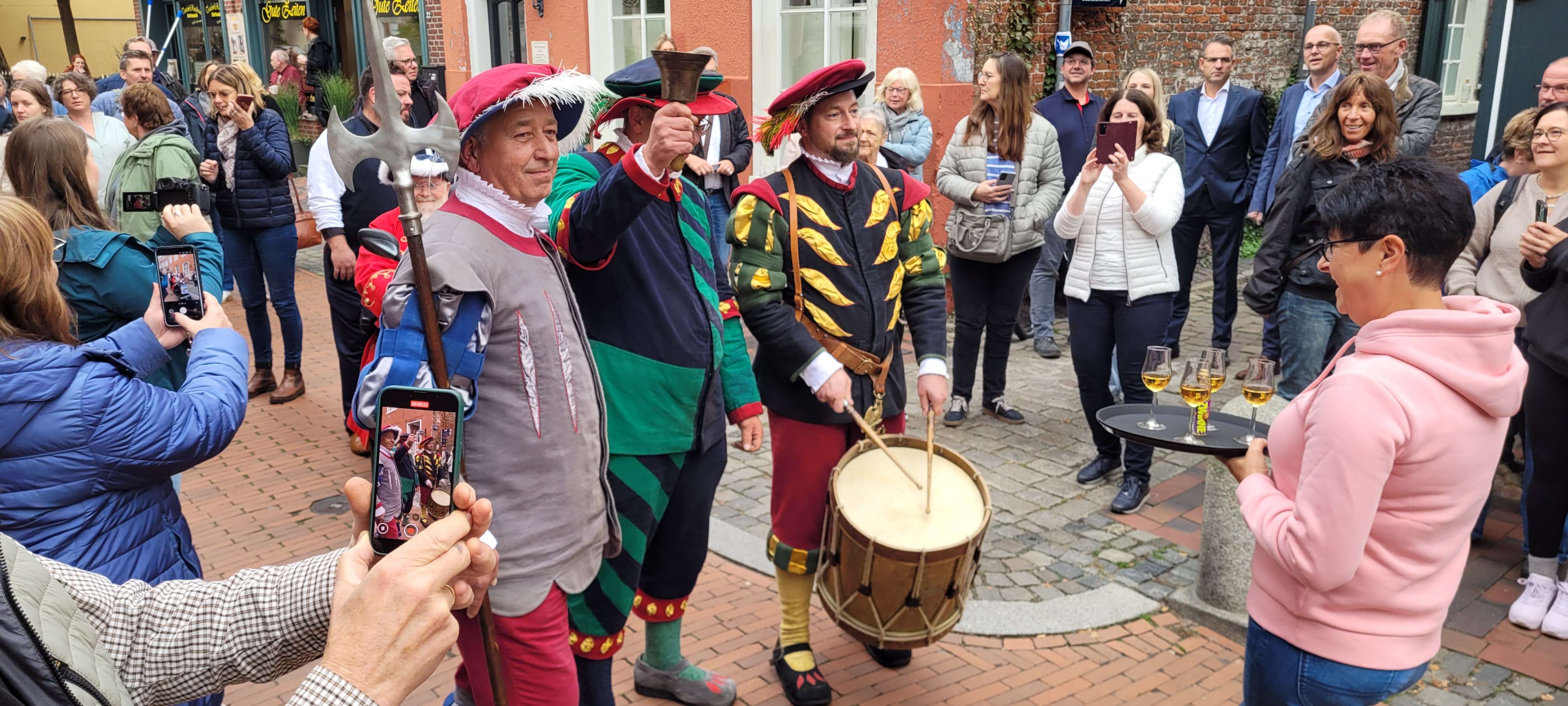 Der Bürgermeister von Leers englischer Partnerstadt Trowbridge, Stephen Cooper, und seine Frau Sharon sind auch zu Gast bei der Gallimarktseröffnung. Ausrufer Trevor Heeks hat 1987 das erste Mal die Stadt Leer besucht, “es war der Beginn der Freundschaft zwischen Trowbridge und Leer.” Seit 1986 ist er Ausrufer seiner Heimatstadt Trowbridge. Seit 2016 ist er Ehrenherold der Stadt Leer.