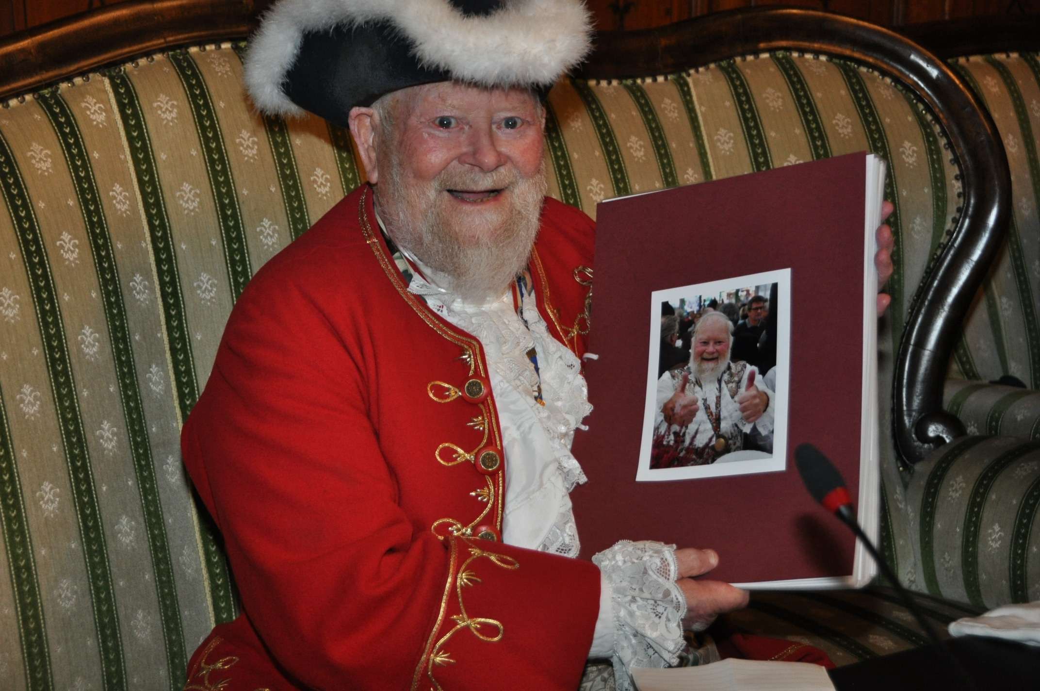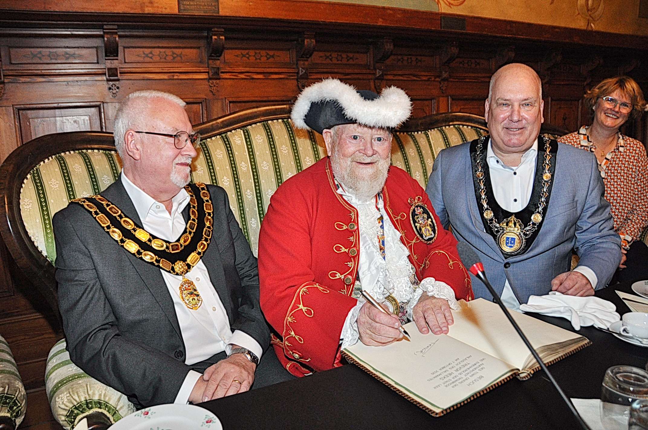 “Trevor Heeks ist längst das Gesicht des Gallimarktes geworden.” Am Dienstag durfte er sich in das Goldene Buch der Stadt Leer eintragen. Aus gesundheitlichen Gründen ist es sein letzter Auftritt auf dem Gallimarkt. Mit einem kräftigen “Oh Yeah!” begrüßte er die Besucher vor der Rathaustreppe. “Ich überbringe Grüße aus Trowbridge, der Partnerstadt von Leer, zum 517. Gallimarkt”, eröffnete er seine Ansprache auf Deutsch. “Ich liebe der Gallimarkt”, ergänzte er und sang gemeinsam mit den Gästen der Gallimarkteröffnung ein Lied. “Ich liebe Leeraner. God save the king”, schloss er seine Ansprache.