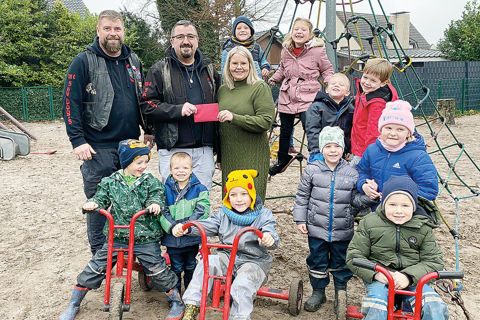 350 Euro spendete der Motorradclub »Sky Dogs« jetzt dem Bunder Kindergarten an der Lindenstraße. »Das Geld können wir gut gebrauchen für Spielzeug im Außenbereich«, sagte Leiterin Ines Ackerstaff- Groen, als Motorradclub-Präsident Andreas Groen (Mitte) und sein ...