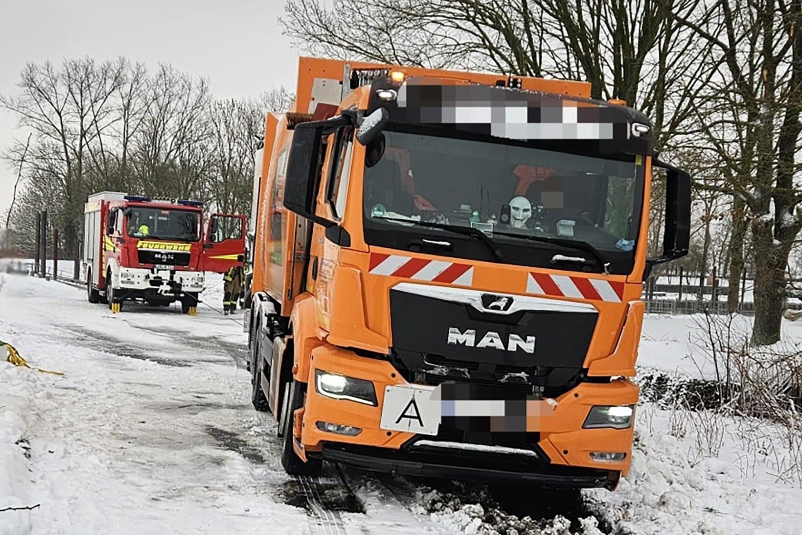Feuerwehr befreit Müllwagen aus Schnee