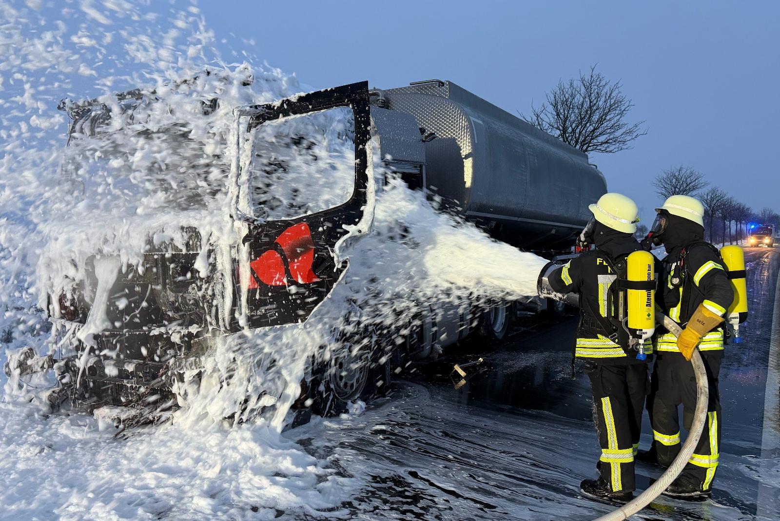 Die Zugmaschine eines Sattelzugs ist heute Morgen in Norden in Brand geraten. Auch wenn die Zugmaschine nicht mehr zu retten war, konnte die Feuerwehr ein Übergreifen auf den zum Teil gefüllten Tankwagen verhindern. Zur Brandbekämpfung kam auch Schaum zum Einsatz.