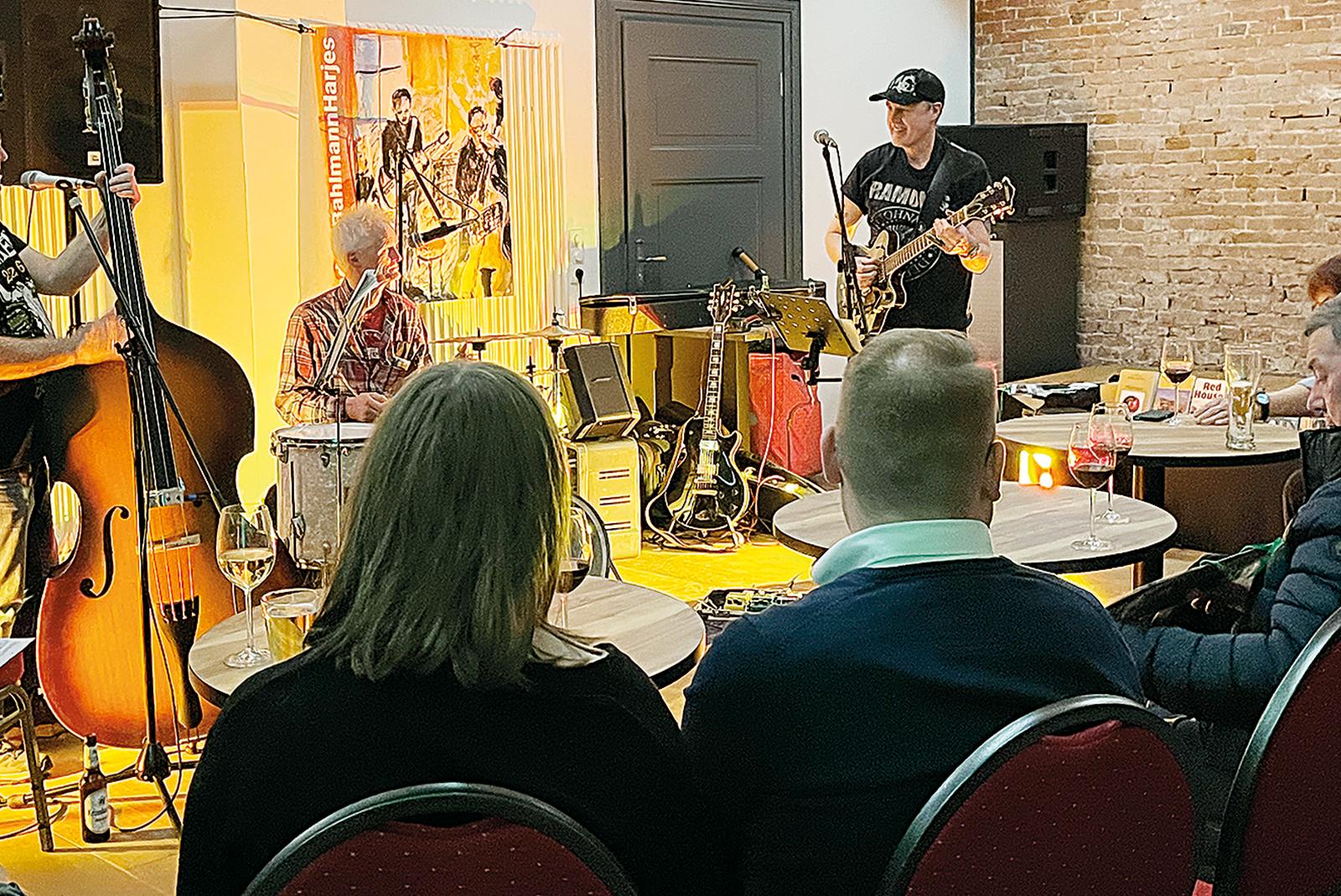 Das Ambiente eines »Wohnzimmerkonzerts« bekam ein Auftritt von Iko Andrae (Kontrabass), Andreas Bahlmann (Schlagzeug) und Eckhard Hartjes (Gitarre, von links) am Samstagabend im Bürgerhaus in Jemgum. Das winterliche Wetter mit Straßenglätte hielt offenbar zahlreiche Gäste davon ...