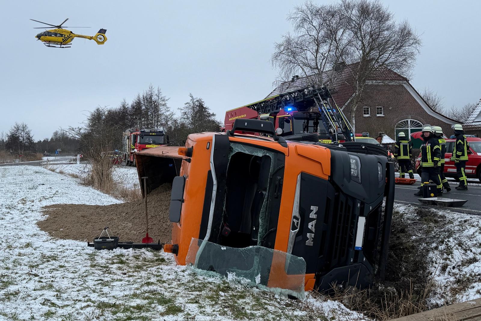 Ein Sattelzug ist am Dienstagvormittag von der Ostermarscher Straße in Norden abgekommen und in einen Graben gekippt. Wie der stellvertretende Stadtbrandmeister Thomas Weege mitteilte, stürzte das mit Sand beladene Gespann dabei auf die Beifahrerseite und verlor seine Ladung. Der Fahrer war daraufhin in dem Fahrerhaus eingeschlossen und konnte sich verletzungsbedingt sowie wegen der Seitenlage des Sattelzugs nicht selbst befreien.